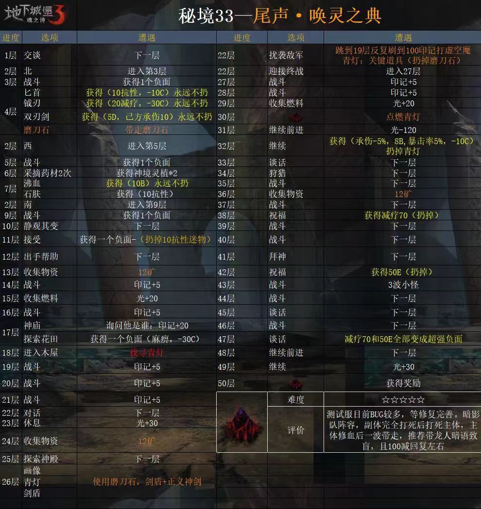 ~~呼呼最近工作忙-。-回来了 仓皇逃离圣火之座后,霍桑和你来到神民之里,并打算为过去所为救赎,阻止炼金傀儡暴动,并履行位面行者和秩序守护者神位启示... 3层BOSS:鸣蛇(削弱前后) 初次战胜(额外获得): 30层BOSS:生骸 初次战胜: 重复获得: 50层BOSS:暴走巨械·赞索斯 初次战胜: 重复获得: 评价:难度低于31,常规队伍 秘境规则概述: 1. 升降梯上升时增加印记,印记满10