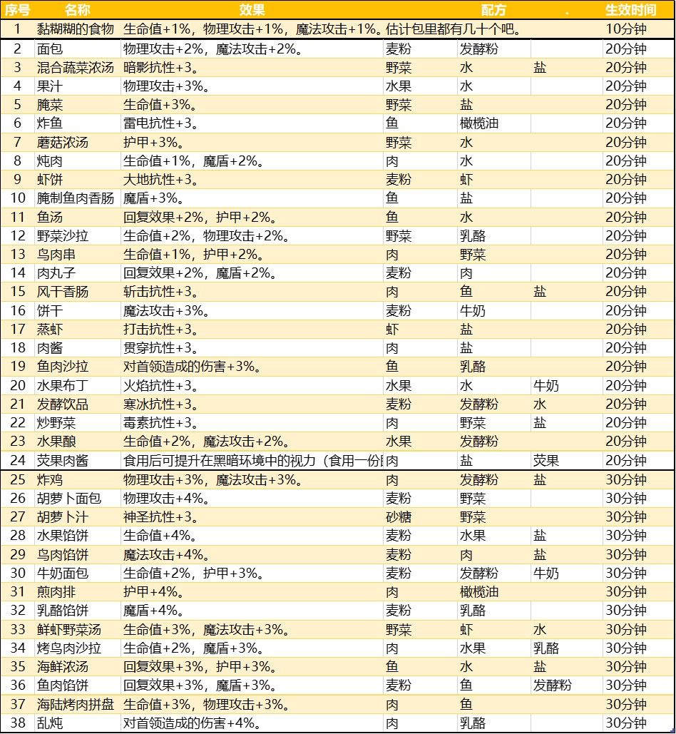 看门狗凭借自己多年的烹调经验~整理了现阶段能做的和能获取到的食物的效果、配方、以及生效时间这些~ 现在发上来和大家交流一下哦~有问题欢迎在评论区指正,会及时进行更新修改!~ (已修改 胡萝卜汁 = 砂糖 + 野菜) 记得来给狗子我点个赞!