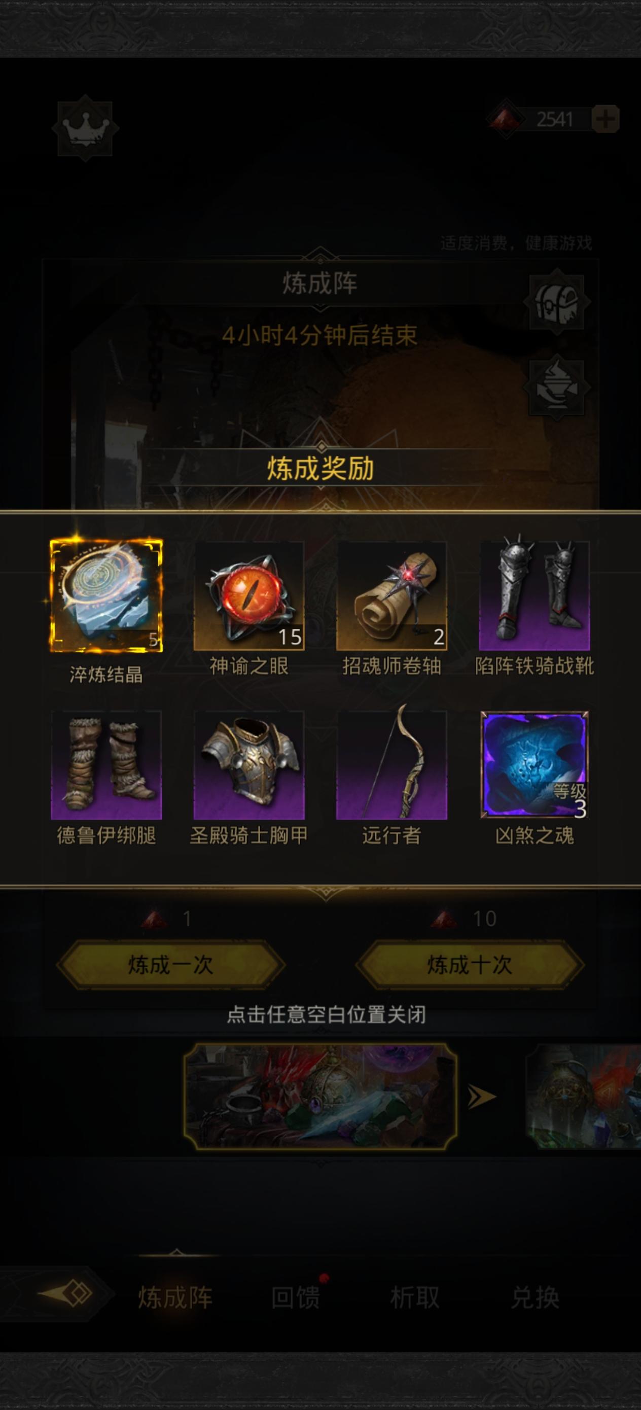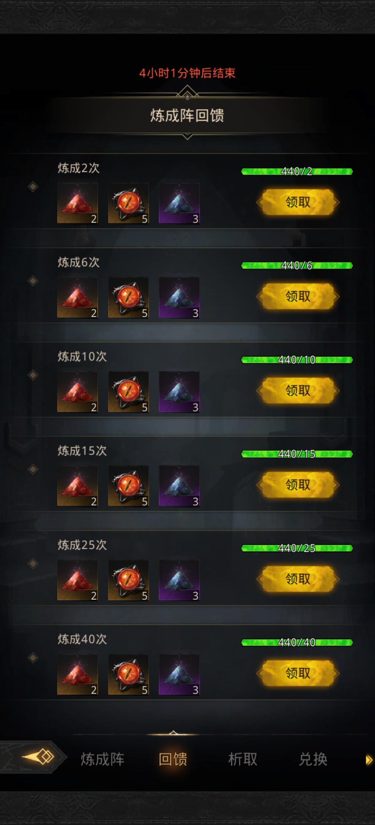 炼成阵是本游戏前期贯穿后期的核心玩法,2025最新更新情报,在有sp情况下,推荐一直250抽完一套阵容武器后,在拿完武器精炼圣物拿完或者直接第一次500沙子就搞树枝,500抽沙子拿树枝做兵鉴,要是收菜大神,更推荐攒830沙子等双倍练成阵,比500沙子收益高很多,然后要是能攒1000抽,拿完树枝收益更高前提警告:如同最开始数目一般,攒250是250,不攒250更是250,盲目攒250也是250