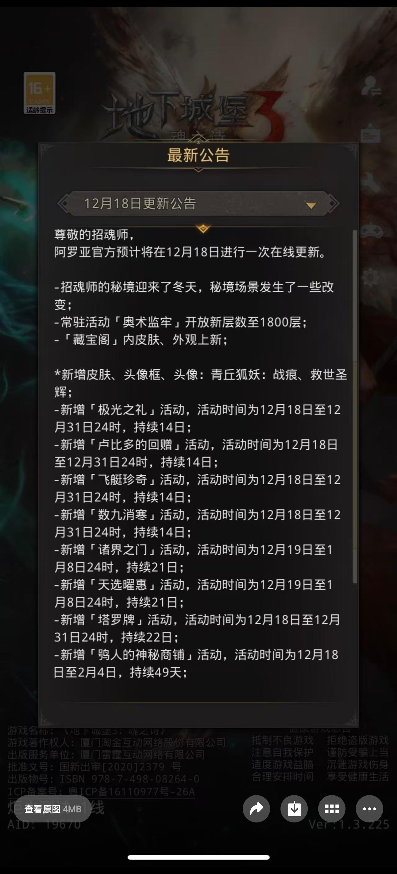 尊敬的招魂师,阿罗亚官方预计将在12月16日14时左右进行一次在线更新。-新增「黑暗秘宝」活动,活动时间为12月16日至12月29日24时,持续14日;-新增「荣誉卷轴」活动,活动时间为12月16日至1月19日24时,持续35日;-新增「领主试炼」玩法解锁方式:「升格之路」通关30层后解锁,领主试炼期间可对领主怪物进行挑战,在试炼结束后排行榜第一名的玩家将成为本期塔主;更新完成后,我们
