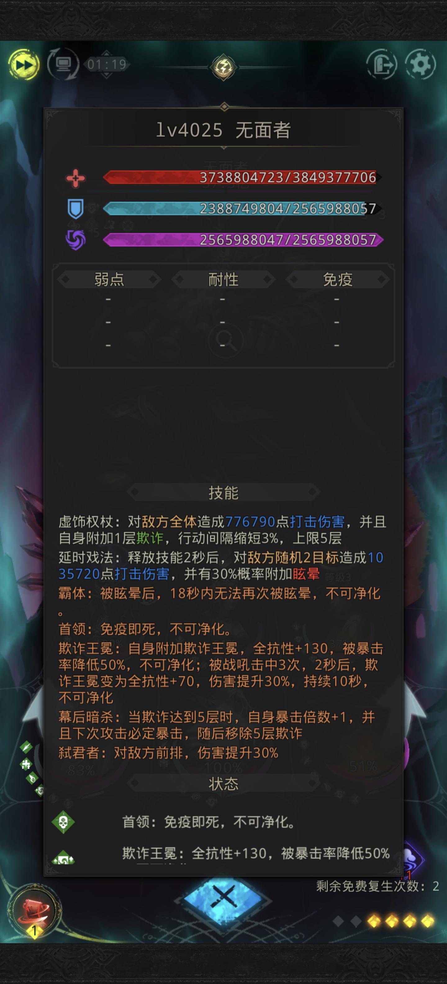 打了两天无面者,这个BOSS太折磨了,无面者虚饰权杖这个技能上面显示的是全体伤害然后自身附加一层欺诈上限是五层,结果有的时候直接就五层了,不知道算不算BUG(已经反馈了),这个延时戏法技能本身没问题,配上这个叠满五层的幕后暗杀伤害就会非常莫名其妙,还是再收收菜吧