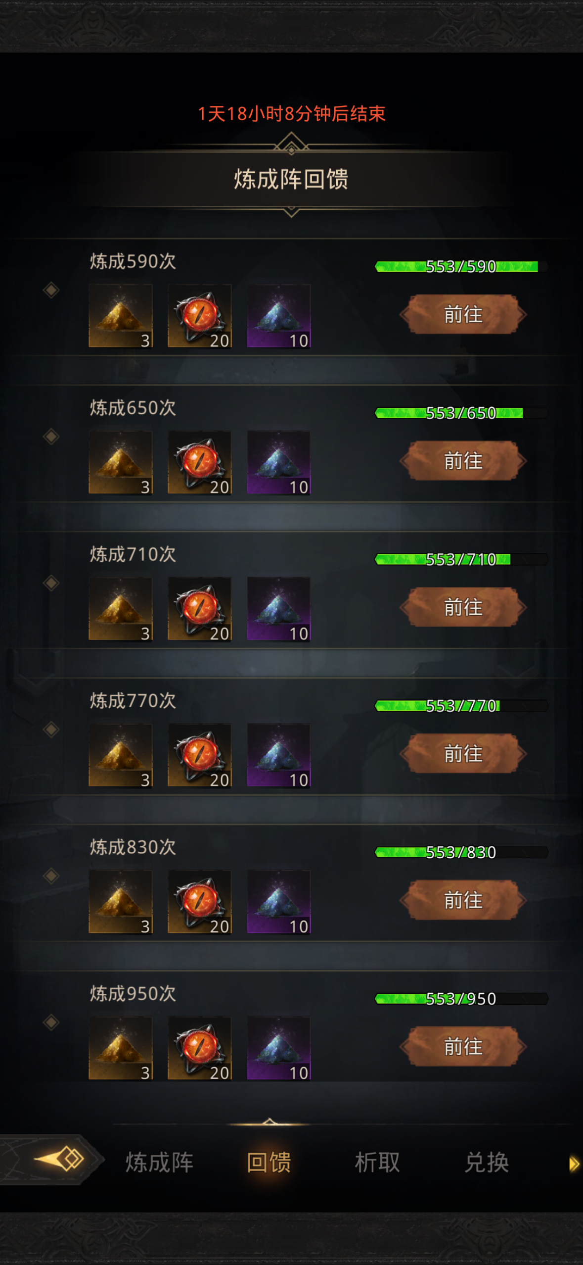 炼成阵是本游戏前期贯穿后期的核心玩法,2025最新更新情报,在有sp情况下,推荐一直250抽完一套阵容武器后,在拿完武器精炼圣物拿完或者直接第一次500沙子就搞树枝,500抽沙子拿树枝做兵鉴,要是收菜大神,更推荐攒830沙子等双倍练成阵,比500沙子收益高很多,然后要是能攒1000抽,拿完树枝收益更高前提警告:如同最开始数目一般,攒250是250,不攒250更是250,盲目攒250也是250