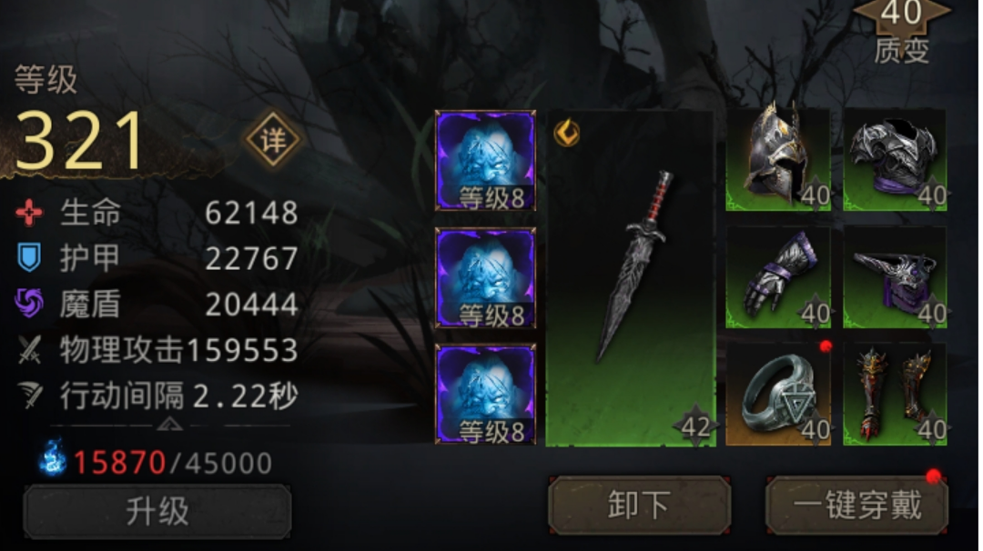 之前一直单核千面,过塔里厄斯太痛苦,今天用幼狮试了试,碎片一直攒着没用给幼狮觉醒了二日升到321级,带了三个加物理攻击7%的食物,没想到运气好,试了四五次过了