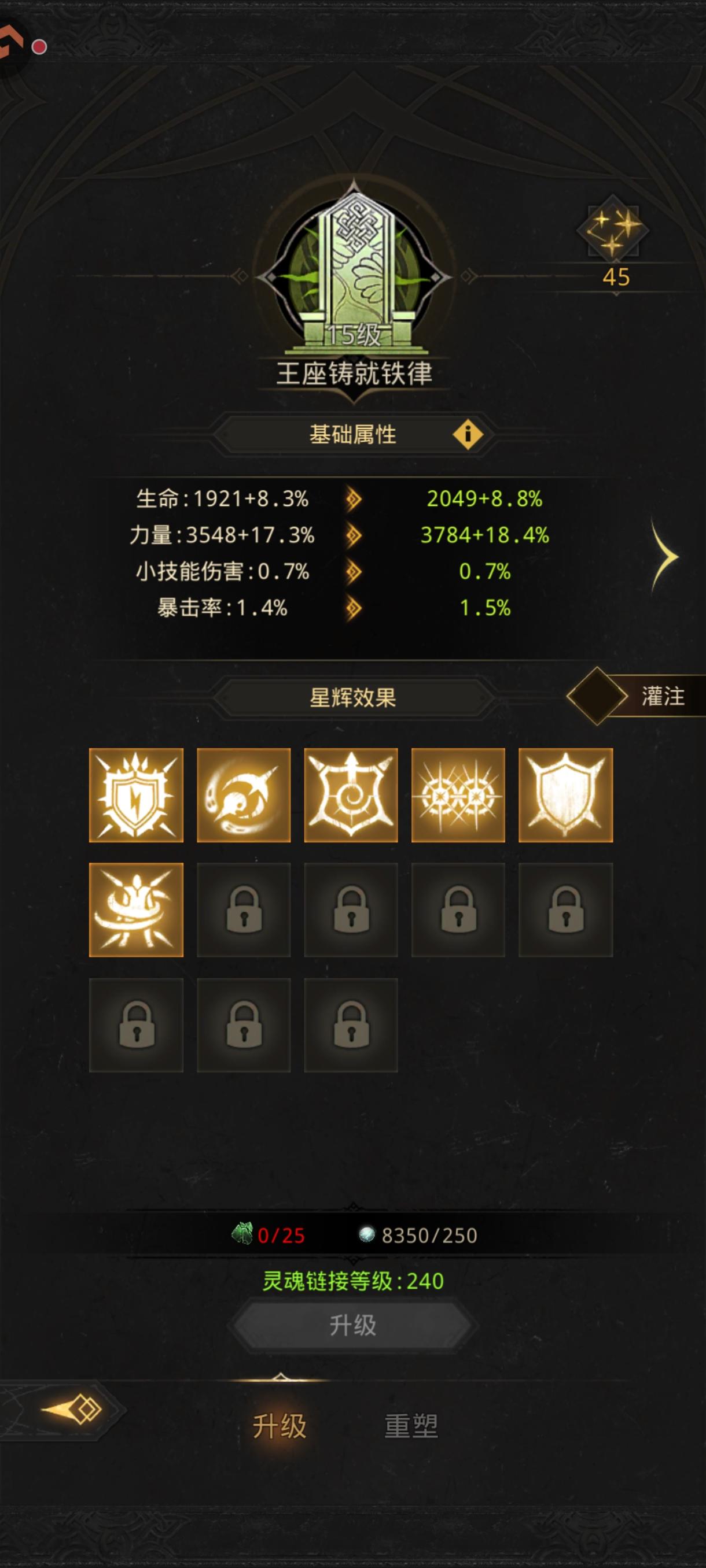 第一,先升级开孔在灌注,因为灌注是随机顶替,升级越高开孔越多,灌注覆盖垃圾的可能性越高,不然有可能就是覆盖你洗好的词条第二,看自己是玩刮痧鸟=力量小技能,战吼有阿莎=魔力战吼,大漠=力量战吼,先看自己主c是力量还是魔力,输出技能是小技能还是战吼,在选择合适的星痕第三,重塑有概率会出现耀前缀,无论洗的属性好坏,先保存,耀前缀是可以保存的,出现耀之后保存以后洗出来的属性基础是>没有耀前缀的第四,