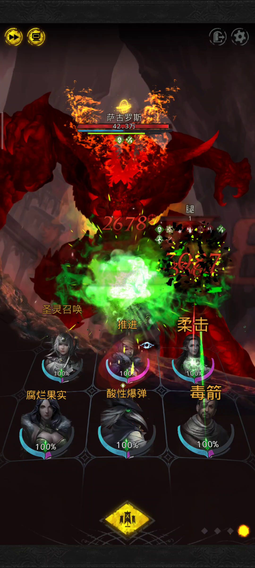 撒古螺丝机制 双BOSS 腿哥和本体都会在七十秒后开狂暴 腿哥不死,永远留一滴血 本体会在腿哥只剩百分之三十也就是三万多血的时候停止攻击,给腿哥回血。 打法核心 中毒除了持续性毒伤,还会降低百分之三十的回复效果,一层中毒后原本能回100000的奶量只能回70000,而不同角色的中毒效果都可以给敌方叠加,三层中毒,腿哥每次就只能回一万多血,也可以上二毒,只是比较容易翻车。 如果拥有群攻战吼或技能的卡牌,就不需要切换攻击目标,来对本体造成伤害,只需要挂机就好。 我的情况是没有好用的金色群攻法师,所以就用乌鸦了,乌鸦的战吼是群攻外加必定中毒。 北方和奥托只有一个技能必定中毒,可以在卡牌立绘界面点击战术设置使用那些技能。