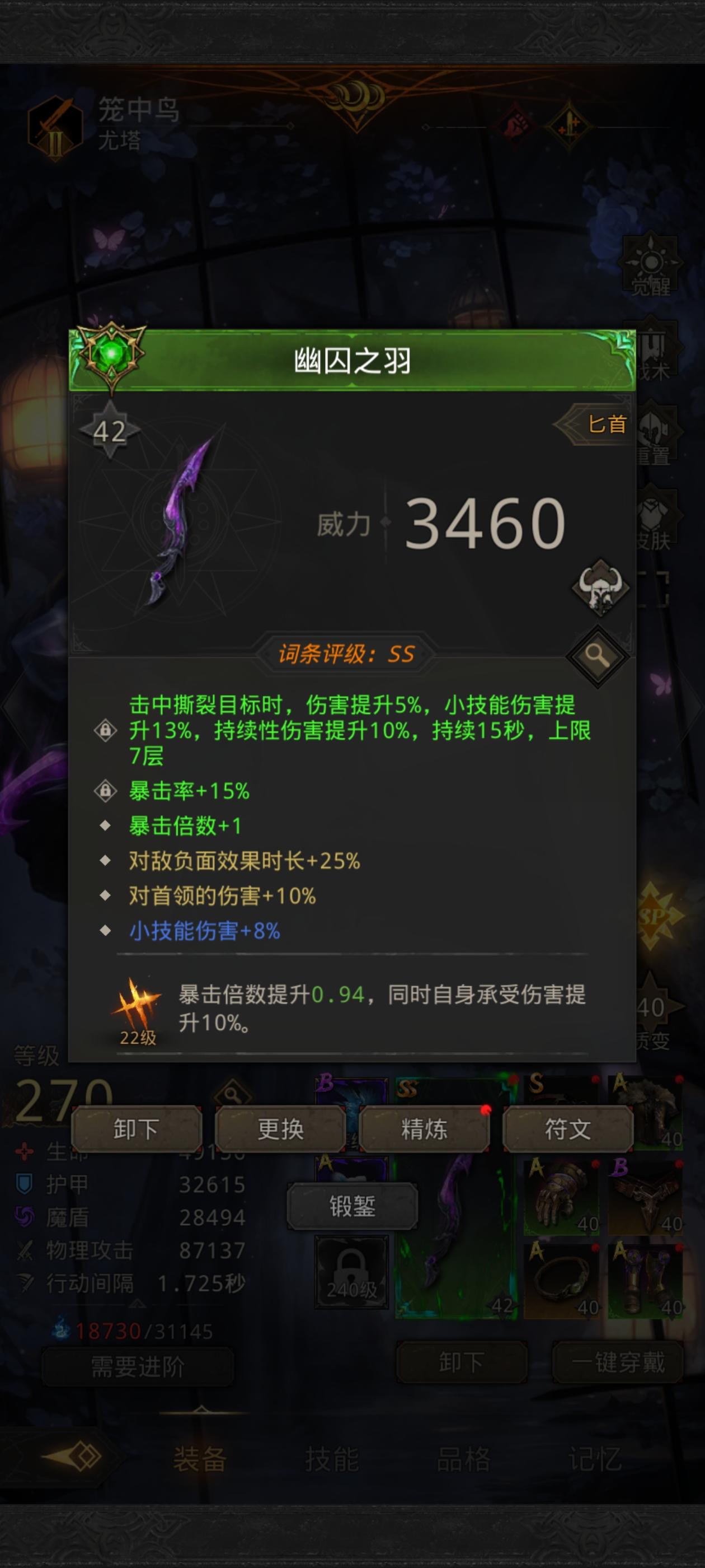 无面者也是拿下了,升级了几级圣物打了一次发现恐惧不叠加,桶中人的恐惧和生灵之灾的恐惧只能生效一个,就把生灵之灾换成了流光锐刺能加15的贯穿伤害,这一次也是运气非常逆天,延时戏法一直都打在龙人身上,装备还是得多不然来回的还是那一套