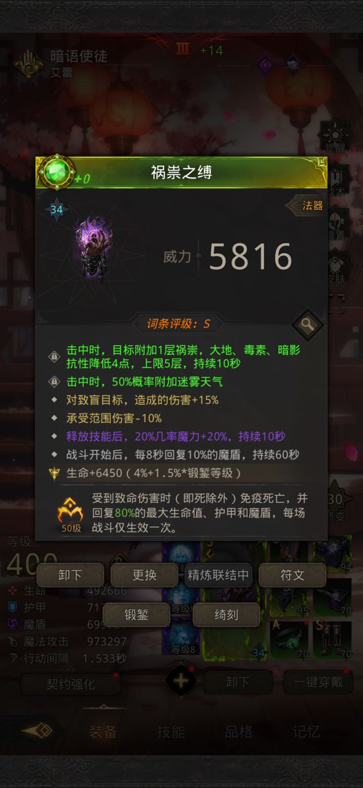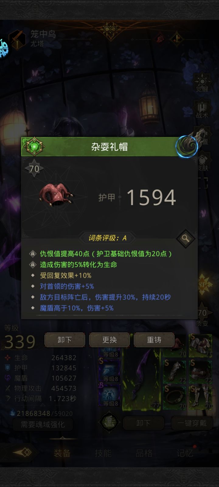 因为古龙遗骸为全体伤害,这边使用小巧思,笼中鸟带小丑帽吸血即可解决续航问题这边因为个人养成方向兵鉴侧重突出只有我自己号兵鉴6减伤,魔物15-18减伤,救赎衣服7减伤,龙女自带20抗所以把龙女等级抵押给小青,提前贷款出一个五阶小青,容错率拉满,一把多两个豆