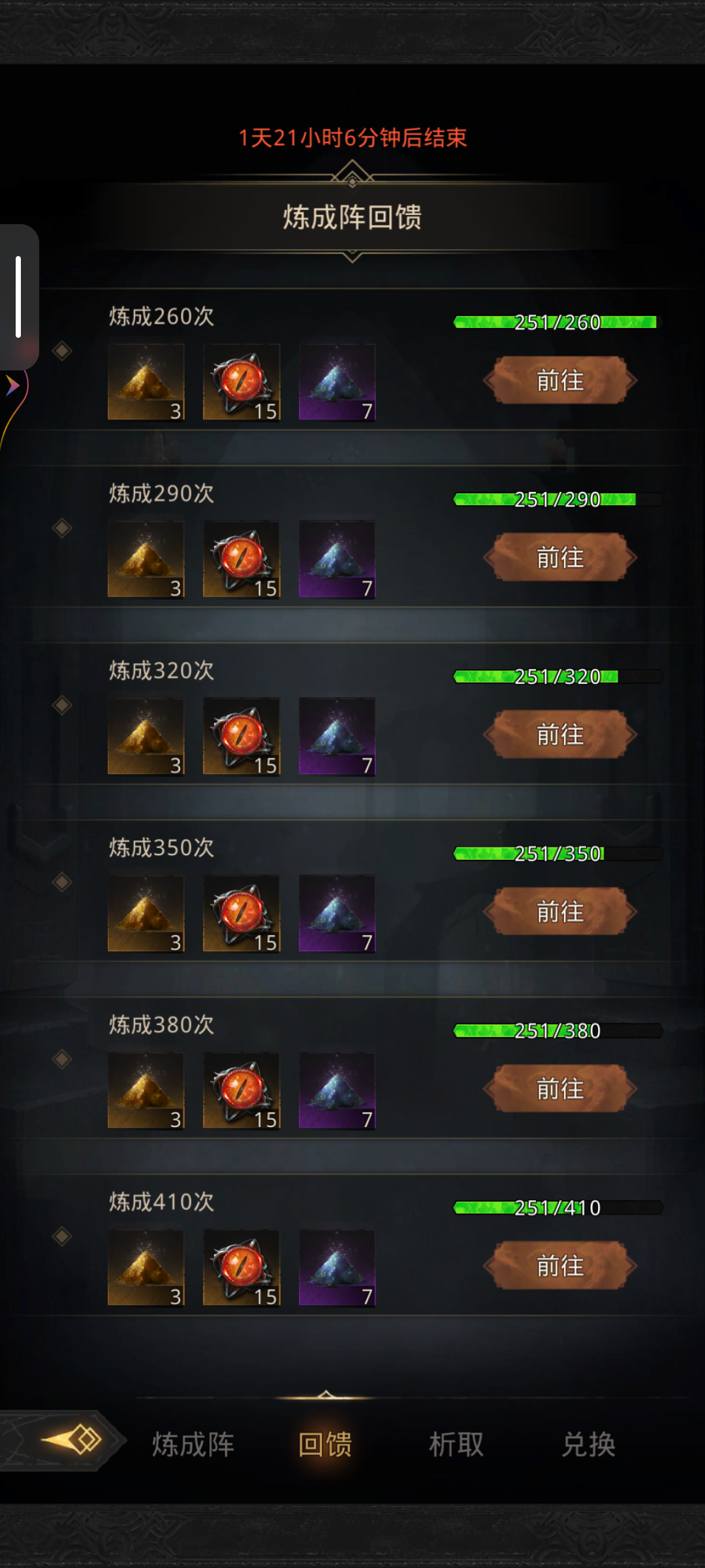 炼成阵是本游戏前期贯穿后期的核心玩法,2025最新更新情报,在有sp情况下,推荐一直250抽完一套阵容武器后,在拿完武器精炼圣物拿完或者直接第一次500沙子就搞树枝,500抽沙子拿树枝做兵鉴,要是收菜大神,更推荐攒830沙子等双倍练成阵,比500沙子收益高很多,然后要是能攒1000抽,拿完树枝收益更高前提警告:如同最开始数目一般,攒250是250,不攒250更是250,盲目攒250也是250