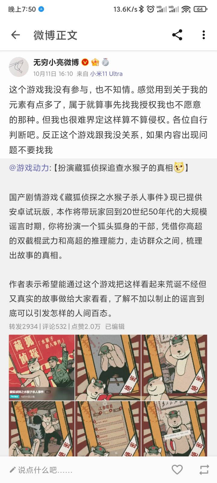 大家好,我是制作组的制作人员(我们组除了我,还有一个美术小姐姐)首先对所有玩家造成困扰表示抱歉,我们确实没有拿到授权就发布了游戏测试因为我小的时候接触了水猴子的文化,一直以为只是家乡的民俗传说,所以看了小亮的视频后大开眼界,就对这个题材非常感兴趣,想做一个相关内容的同人作品没有游戏收费、盈利等等,只是出于兴趣做了这个游戏之前联系小亮时,可能私信太多没有看到,给小亮老师造成了困扰真的非常抱歉