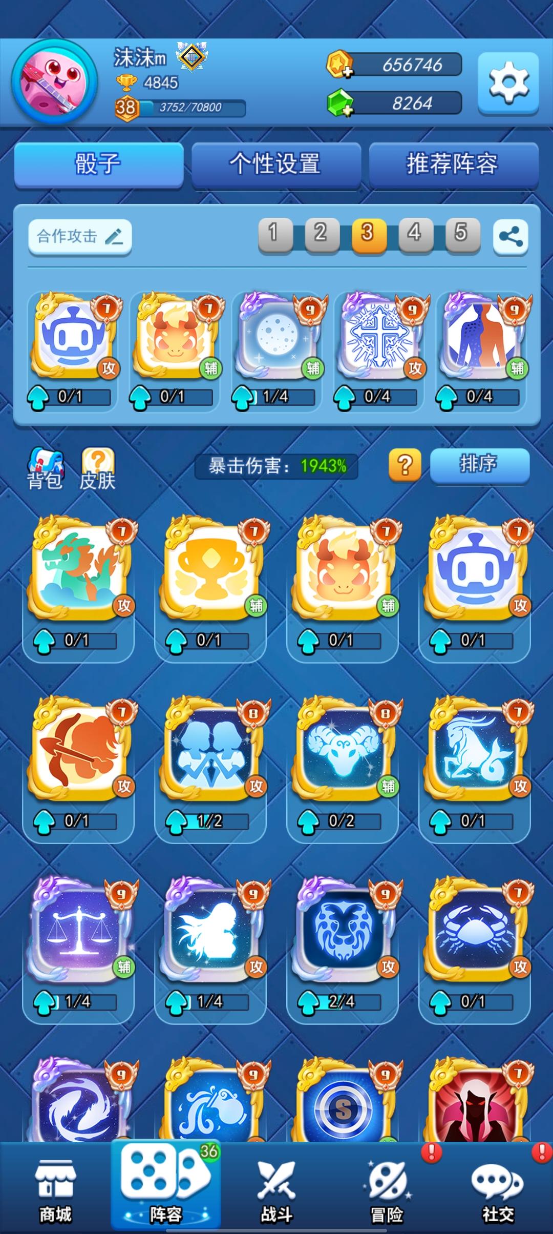 因为巨齿鲨可以无限吞噬,唯一的缺点就是无法吞噬自己,所以场上的巨齿鲨就会越来越多,导致蒲公英的地盘越来越小,而巨齿鲨必须要多吃才能展现出他的实力,所以就出了熊猫巨齿鲨的阵容,巨齿鲨可以吃所有骰子,而熊猫可以吃巨齿鲨,且吃完后星级还会继承,比起吞噬和黑洞来说更好,因为黑洞和吞噬吃完只加自身属性而不会像熊猫一样提升星级。 欢乐对决熊猫巨齿鲨玩法教学图解这套阵容是用于合作模式下,在合作模式下前期获得的d