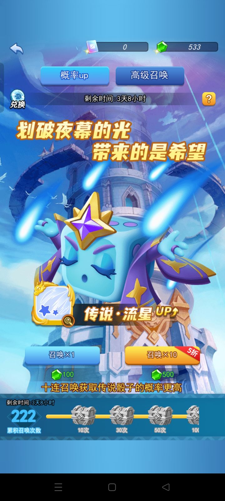 这是一份新手攻略,我刚玩的时候踩过不少坑,所以希望萌新们看到这份攻略能少踩一点。前言:最好在周六~周三开号,因为周四周五开号会少一个传说骰子,完成新手活动的可能会小一些。第一部分,坑点:首先先说一下踩坑点,这是全篇最重要的一部分,所以放在开头。一,限时召唤限时召唤是新手特有的活动,可以消耗限时召唤券或钻石抽取骰子,在限时召唤中UP骰子出现的概率会更高。(限时召唤UP骰子固定“流星雨”)坑点