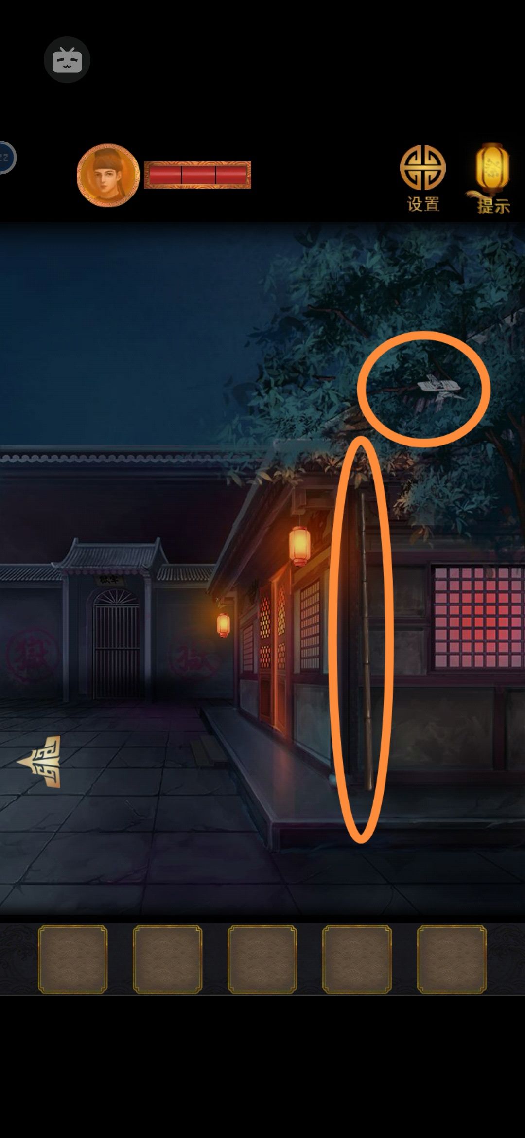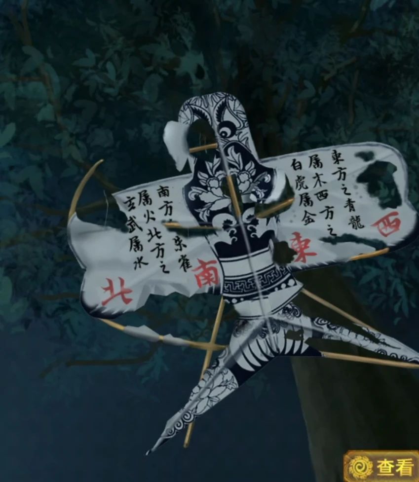 剧情过后拿走中间偏右的竹竿,然后查看右边树上的风筝,使用竹竿拿到风筝,看到线索北南东西,北=水,南=火,东=木,西=金,所以我们获得了四个属性密码水火木金,之所以知道不是四圣兽因为已经看到过锁了啊,不过我们不着急进门先调查一下外面院子。 查看左边的院子,棋盘上红绿色很明显,我们可以画个图红色用0绿色用x,也可以等用的时候再来看,左边院子窗子上有奇怪的颜色,后面我们估计要找些镂空的东西来看,地上的炉