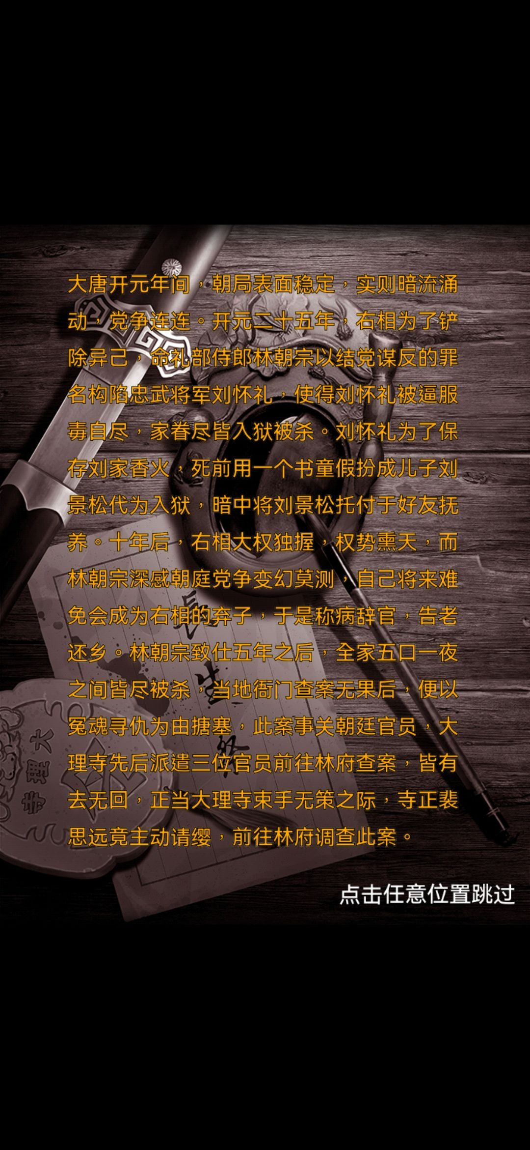 第一章:寻案官 1.(县衙外)点击右侧栏杆处,获得【铁棍】 2.点击松动的地砖,用【铁棍】撬开,获得【石眼球】 3.点击左侧的石狮子,装入【石眼球】,获得【铜钥匙】 4.点击门上的锁,用【铜钥匙】打开,进入县衙 5.(县衙内-右边场景)点击地上的荷包,打开,获得【小钥匙】 6.(县衙内-中间场景)点击左边的凳子,获得【火折子】 7.点击匾额下面的图,完成拼图小游戏,获得【铜叶子】 8.点击桌子上的