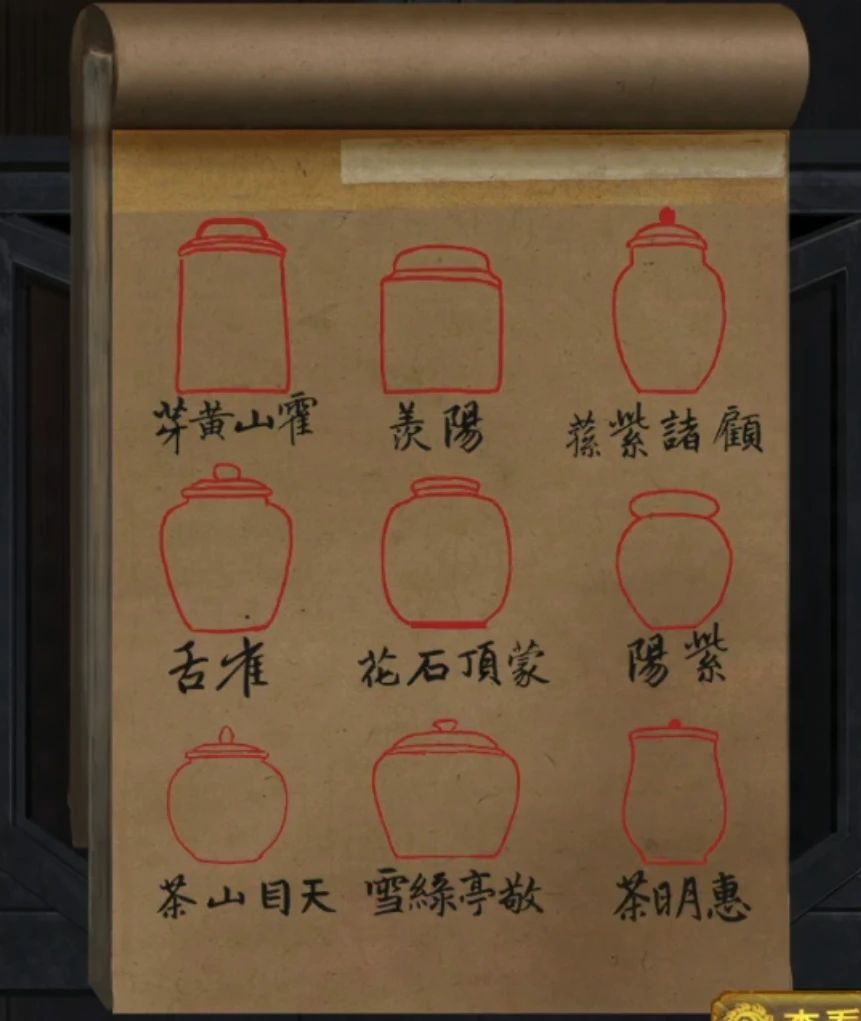 第三章:代面客 1.(街上-左边场景)点击茶馆门上的机关,调整机关,打开门 2.(茶馆)点击桌子上的筷子筒,获得【一根筷子】 3.点击柜子,调整上面的机关 4.打开柜子,获得【账本】和【刷子】 5.点击柜子上方刻有茶叶名称的牌子,记住茶叶的位置 6.点击右边的柜子,根据牌子上茶叶名称的位置和【账本】上茶叶名称对应的罐子,摆对柜子上的罐子的位置,打开柜子,获得【一碗面粉】 7.(茶馆后厨-左边场景)
