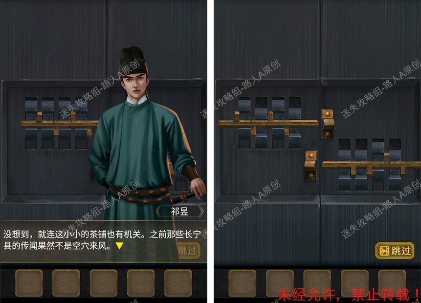 攻略作者:迷失攻略组-路人A 未经许可,禁止转载,侵权必究! 第四章 98.完成拼图,敲门进入林府。98.1 99.扶起倒下的牌位,拾取【钥匙】。99.1 100.掀起桌布,用【钥匙】打开桌底下的箱子,得到【灯笼】。100.1 101.用蜡烛点亮【灯笼】,扶起倒下的凳子,将【灯笼】挂上房梁。101.1 102.移动凳子,查看两边灯笼照亮的房梁,根据文字的高低位置,调整香炉机关,得到【玉佩】。102