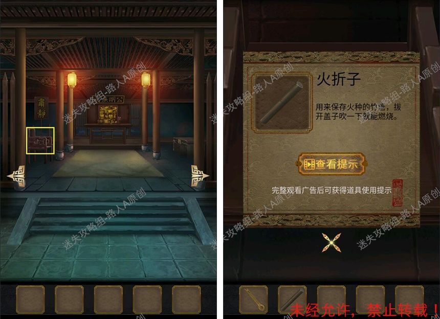 攻略作者:迷失攻略组-路人A 未经许可,禁止转载,侵权必究! 第一章 1.拾取【钥匙】和【火折子】。1.1、1.2 2.用【火折子】点燃桌上的油灯,拿走【点亮的油灯】。2.1 3.用【钥匙】打开桌上的盒子,得到【发簪】。3.1 4.完成拼图机关,得到【铜叶子】。4.1 5.用【发簪】打开门锁。5.1 6.拾取【锄头】和【盘子】。6.1 7.用【锄头】挖开泥土,得到【蚯蚓】。7.1 8.用【蚯蚓】引