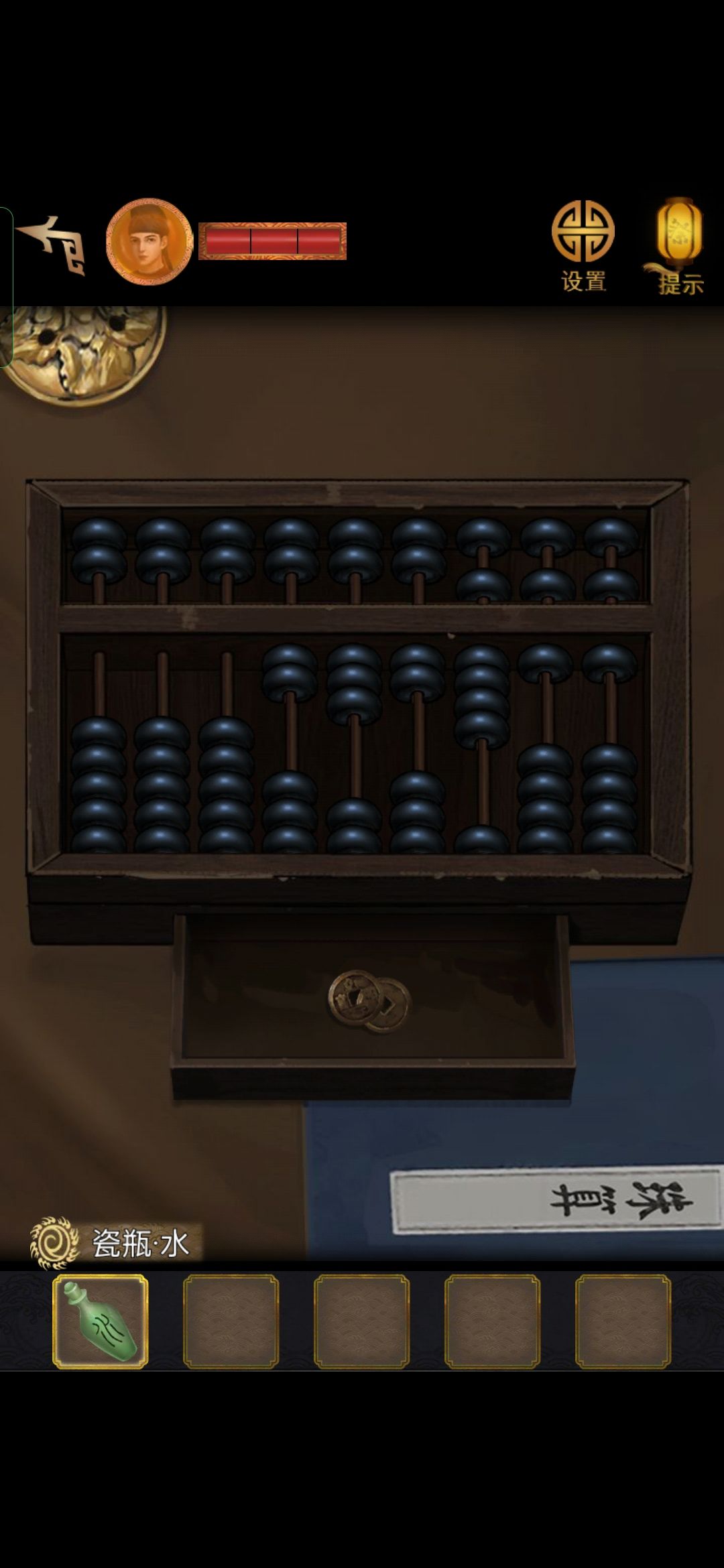 第四章:影中人 1.(林府二楼-小姐房间)根据帘子上挂饰的位置调整黑棋子的位置,暗格打开,获得【银饼】 2.(林府二楼-二楼走廊)点击左边第二个房间的门,放入【银饼】,打开门 3.(二楼-二少爷房间)点击桌子,获得【双鱼风铃】 4.查看桌子上的《珠算》 5.点击柜子,放上【双鱼风铃】,打开带有动物图案的柜子,获得点数线索:(玄武-1、大象-2、麒麟-3、朱雀-3、双鱼-5),根据柜子的信息,点击风