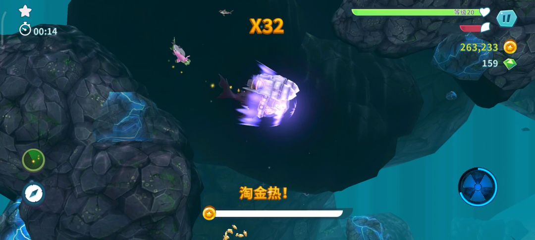 玩饥饿鲨的时候会时不时的来一次淘金潮!!!我开始没在意,后来领悟到,淘金币的时候,尽量多吃掉金色的食物,包括鱼类和海面上的鸟类等等,当界面下方的金条币累积满的时候,就会进入淘金币的时间!!不过淘金币的时间比较短暂,只持续几秒,在这个淘金币热潮的时间里,我们的鲨鱼一般就是无敌状态,即便比自己等级高的鲨鱼或者平常足以要命的鱼雷都可以当点心吃掉。 当然了,这种状态可遇不可求啊!不知道是不是我手机的问题,