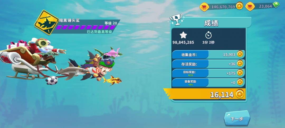 礁鲨满级以后是灰鲸鲨!!就是我现在的,血槽长了,也可以下深一点的水域之中,不过还是吃吃吃吃的攻略。金币够了就赶紧进化咬合力和加速度,只有这些都加满了以后才能进化到下一个鲨鱼!每日登陆那里一定要去领,现在是金币和绿钻交替的,这两个都有解锁鲨鱼品种和技能装备的作用。 在这里要说的是装备里除了花金币和绿钻的,还有些只要看广告就可以破解的!像稀有牛仔帽只要连续看15个广告就可以。我升级一个牛仔帽用了差不多