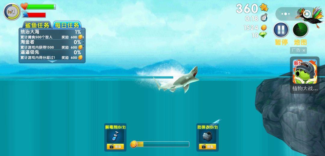 我觉得在饥饿鲨进化中,如果指着鲨鱼吃鱼赚金币来升级估计2021年是悬了,不过今天刚刚研究了一下,日常签到这个之前已经说过了,除了每日任务外还有鲨鱼任务和成就。 鲨鱼任务的话像什么游泳课、食人族、绝不挑食等等这些我都是不知不觉中完成的,现在来看可以提前看一看,比如游泳课只要游500米就完成了,这样奖励是200个金币,如果看广告可以3倍奖励的。其他的任务也可以这样来,提前看一下任务内容,后期鲨鱼在水里
