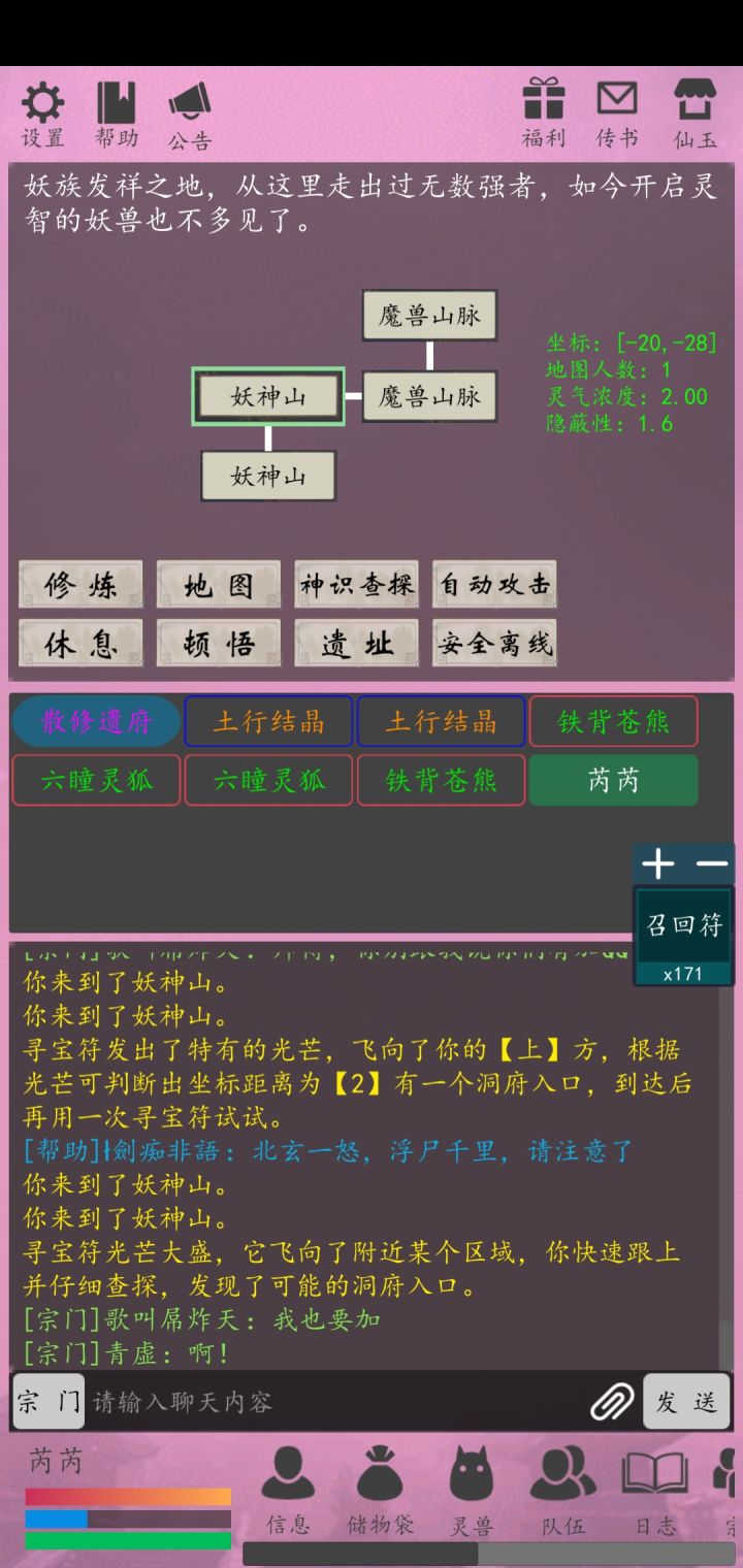 修真是有副本这种东西的,下副本可以获得大量物资,副本目前分为散修,仙人,宗师,丹王,大阵,神魔古战场,仙界,神秘传承,命运传承,还有各种宗门的印记副本。先讲散修这就是散修,想找到副本也就是洞的话需要一种叫寻宝符的东西,筑基用白色寻宝符,结丹绿色,元婴蓝色,化神紫色,合体以上都是橙色,寻宝符可以自己做,也可以去坊市,符阵,购买散修物资点:还有一个隐藏boss,可以掉手镯装备,就是难度比路上的