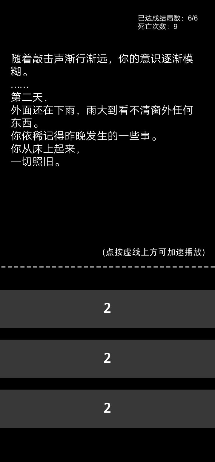死亡数那边是故意的结局:1.出门后回家2.一直睡觉(别动)3.打翻水杯去浴室,先解密再砸门(会发现镜子里没有影子)4.一直下楼(木鱼会停在三楼以上)5.一直上楼(中间看一次门牌号就行了,别回忆)6.同3,只不过直接砸门(然后有一堆人欢呼)