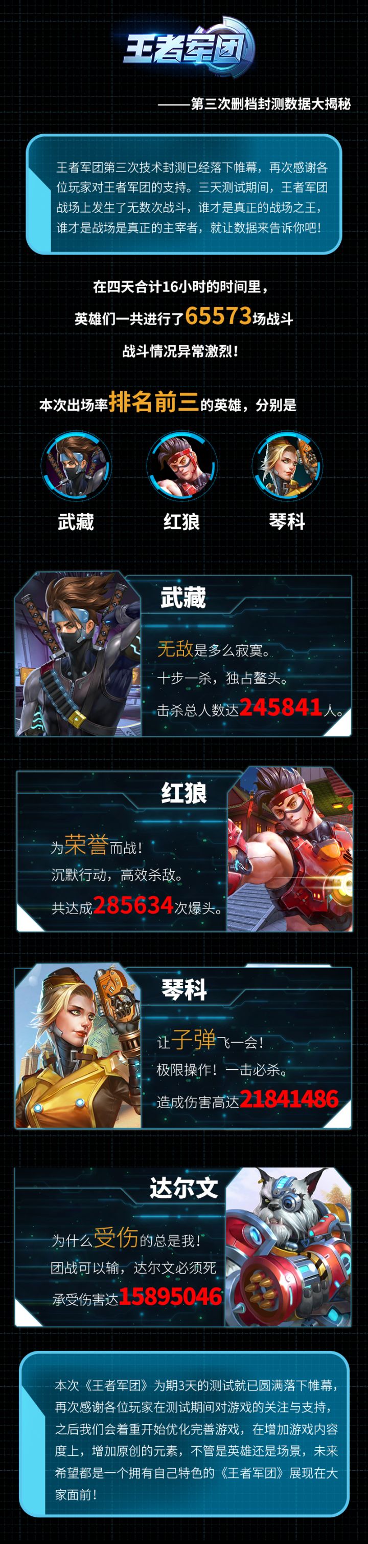 《王者军团》第三次技术测试于5月1日23:00正式落下帷幕, 我们带大家去看一下三测的一些数据吧!