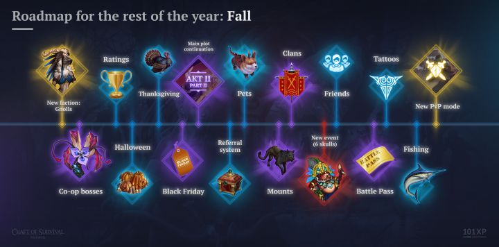 夏季更新路线:PVP竞技场,温迪戈重做,新地牢,新武器新衣服,新boss,新剧情秋季更新路线:新势力,合作boss,联赛评分,感恩节活动,万圣节活动,黑色星期五,宠物,氏族和朋友功能,新事件,皮肤纹身,赛季通行证,新PVP模式,钓鱼,新剧情