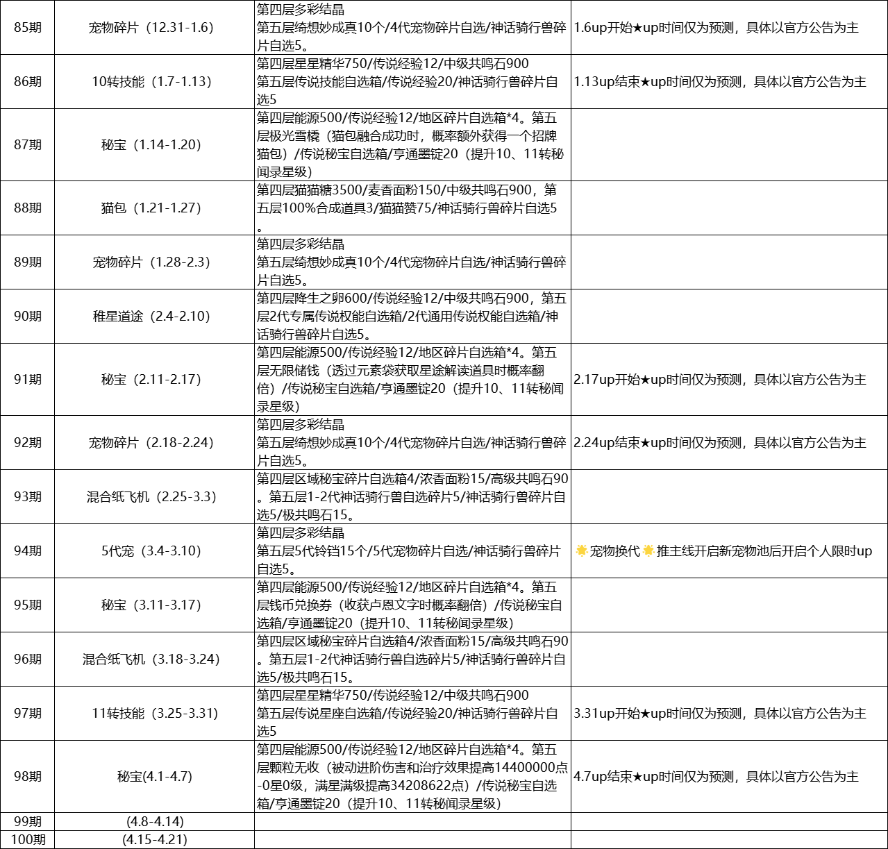 up时间仅为预测,做哪期看自己的规划和喜好。 纸飞机预测图每周原帖更新,可放心收藏食用。 纸飞机预测内容根据台服纸飞机内容写的,国服内容可能会发生变化。 因为2代神话骑行兽上线的原因,纸飞机内1代神话骑行兽碎片变为1-2代神话骑行兽碎片自选。 [表情_流口水]打个广告:无忧小筑长期收人,id100006,无任何要求,有大群,有一堆妹妹