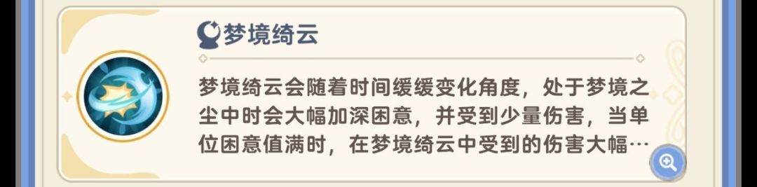 首先界面多了个按钮 这个按钮叫困意(如图一) 当这个困意达到100%点击就可以进去梦境(这个副本有凡境和梦境两个位面) 我们开局在的位面叫凡境,点解困意进去的叫做梦境。 好了那么我们如何去积攒困意呢? 首先我们看看头顶!?是不是有个彩色云朵?(看不到就看地上黑影) 只要我们站在云下面(黑影上面)困意就会增加,但是也要承担少量伤害。这时候你的输出会爆表!DPS会巨高! 从图二我们可以看到在云下输出变
