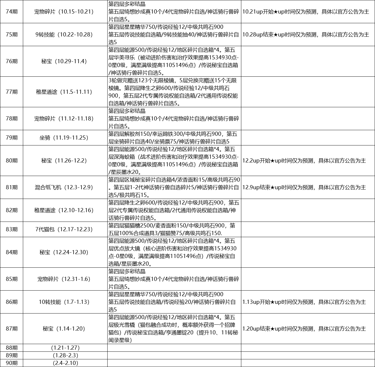up时间仅为预测,做哪期看自己的规划和喜好。 纸飞机预测图每周原帖更新,可放心收藏食用。 纸飞机预测内容根据台服纸飞机内容写的,国服内容可能会发生变化。 因为2代神话骑行兽上线的原因,纸飞机内1代神话骑行兽碎片变为1-2代神话骑行兽碎片自选。