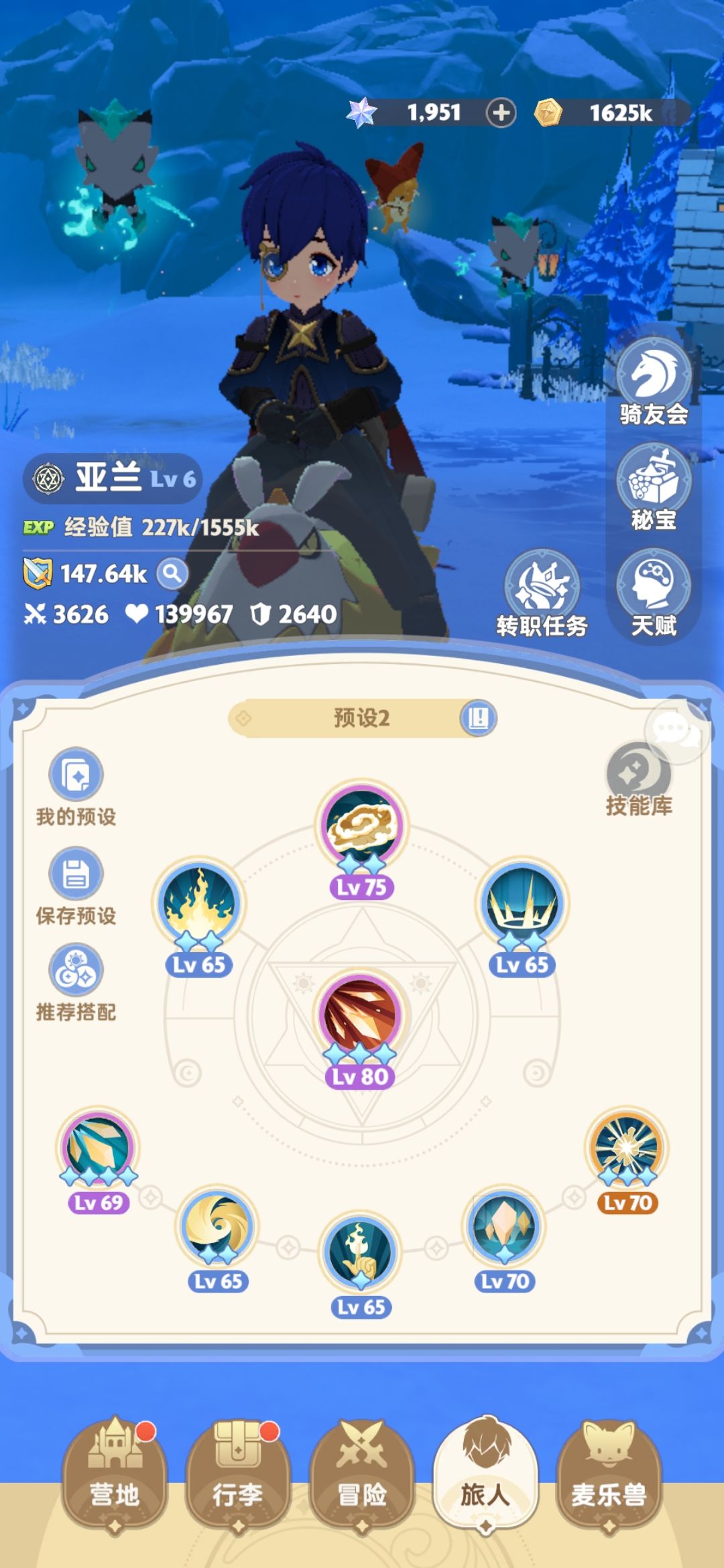书接上文 4.旅人 这里主要涉及到技能和天赋。 技能由于目前0转,只需要拿系统送的券去营地抽,一般抽一百多抽需要的技能都有了,可以留一些等到纸飞机活动再用。 技能搭配上建议主线直接点推荐搭配,应用一个热门的就行,基本都是输出。 打副本服事想走奶妈流尽量带治疗减伤技能(别带减60治疗效果的技能,检查下)剑士走坦克流的话带减伤护盾技能;其他都是输出,一般带好输出技能就够,45副本等可能需要打断,
