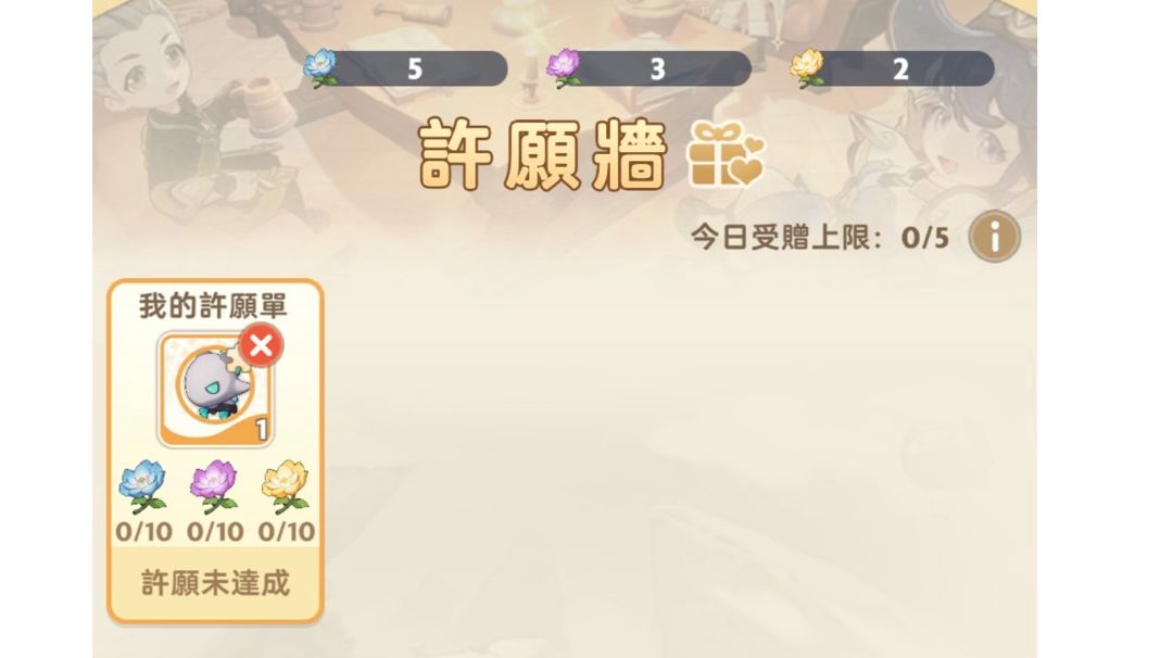 可许愿指定宠物碎片或骑宠碎片 集齐三花色各10朵花花成功许愿一片指定碎片 每人每天可获赠5朵花花为上限,即6天获得1片指定碎片 可通过浇水/调查队/旅团周任务获得随机花花 一次浇水:2朵 一次调查队:2朵 旅团周任务:10朵 每人每周白嫖可获得38朵,平均到每天超过5朵。 (获得的花花只能送别人,不能自用,建议和搭子互送)