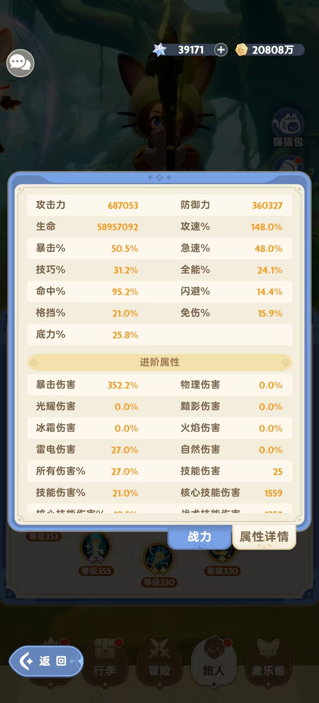 1.面板属性 100%命中>暴击>技巧>急速>全能 装备换最新的六件套和首饰三件套有巨大提升 2.技能天赋 技能见上图。核心思路是4转四件套➕万年狂战➕攻速 天赋还是老套路,平民技能星级没上金冷却不够,一定带冷却缩减,另外一个根据欠缺属性来,平民建议带暴击和技巧补属性,大佬上攻速 3.猫猫包 主猫猫包4转黄油紫4以前还是用3转满星的粉酪,其他3个副猫猫包凑换4转,面包属性加的更多,风味凑出1个红3