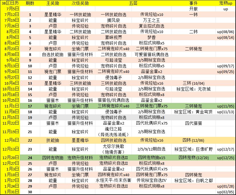 更新:重新更新纸飞机日历,经计算,四转时间和纸飞机开放一致,不受三转延迟一天转职的影响。 泛38区:特指开服时间和38区相近,并且在四转开启新宠物时,能赶上全区服宠物up(12/17 05:00 ~ 12/25 04:00) 目标:尽可能存足够多的钻全部抽新宠物up(前提是狗碎片大于75片,目前看包含本体5片) 推荐的纸飞机 绿底(必拿):先抽满up,可用钻石,做满纸飞机。 黄底(尽量拿):不用钻