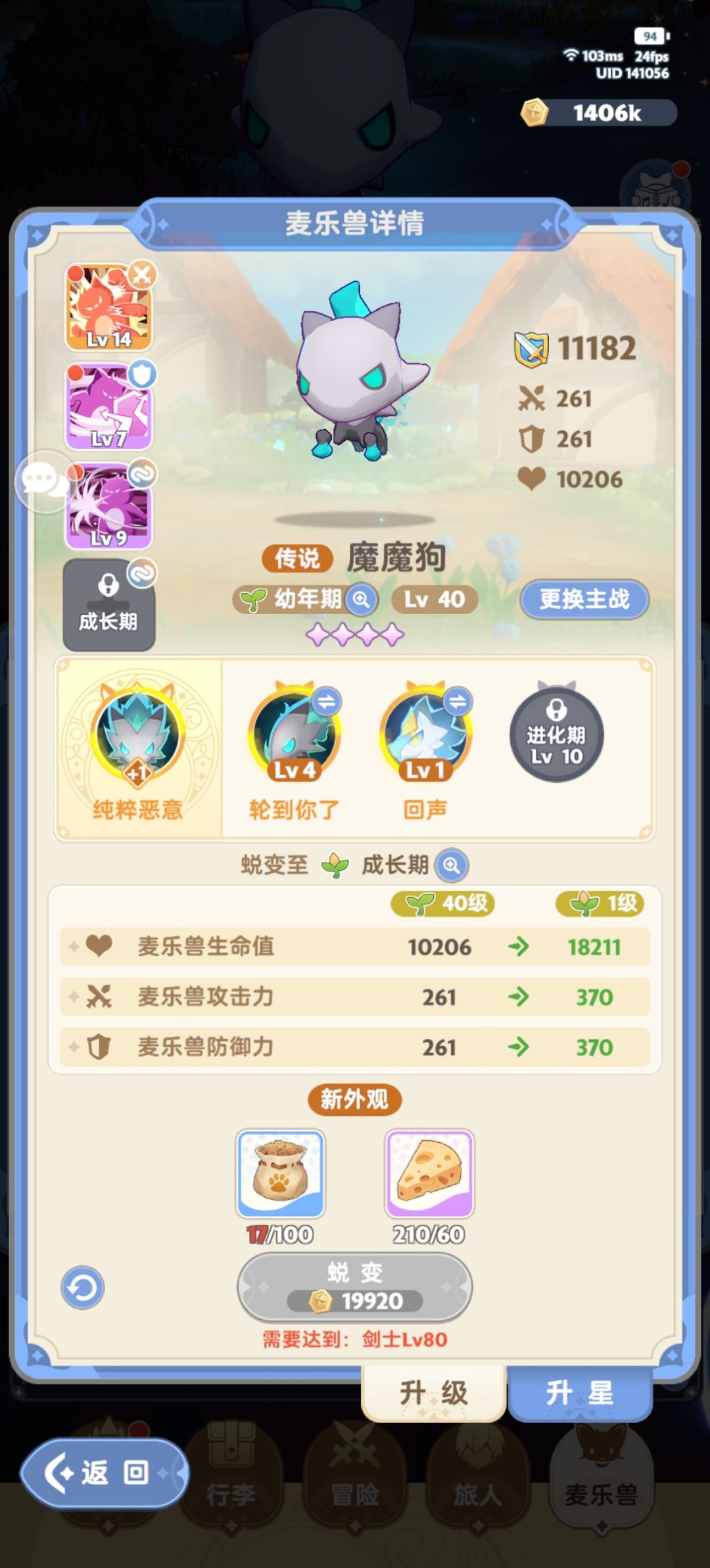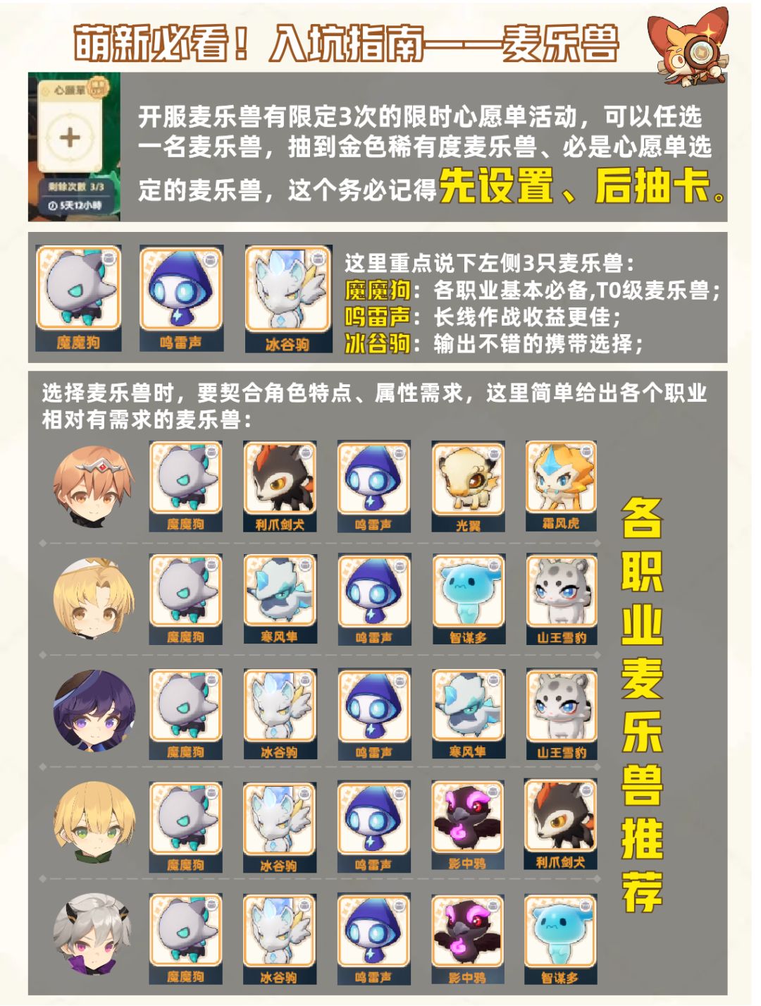 1️⃣当到了30级后,就可以抽麦乐兽了。 先把魔魔狗加入UP心愿单,可以抽3次想要的麦乐兽。 建议一次至少抽50发,基本上有保底奖励,大概率会有你选择的心愿单上的麦乐兽。 这里建议所有职业第一只都抽魔魔狗,最强麦乐兽! 由于这号比较欧,第一次40发就出了,第二次10发出了,第三次30发又出了(第三只我选择的是冰谷驹,你们可以按照自己职业找相关职业攻略建议的抽麦乐兽) 2️⃣还有就是麦乐兽的招式,也