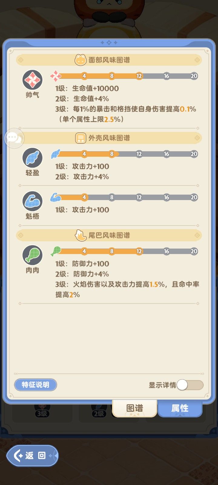 第一个 主线可以看自己和队友的经验进度 以及是否吃了经验药 第二个 猫包可以看当前上阵猫包最终能凑成的风味特征效果,并且多了一键上阵功能。 第三个 猫猫图鉴可以看各种品质猫的最终属性,以及可能会出的风格词条,及属性效果。 当然这个实际上意义不大,毕竟你抽出的还是随机的。 第四个 招式可以点击重置 返回经验 想调属性的 金招式不用浪费掉了 甚至可以先把招式全部重置 冲一个等级 拿成就点数