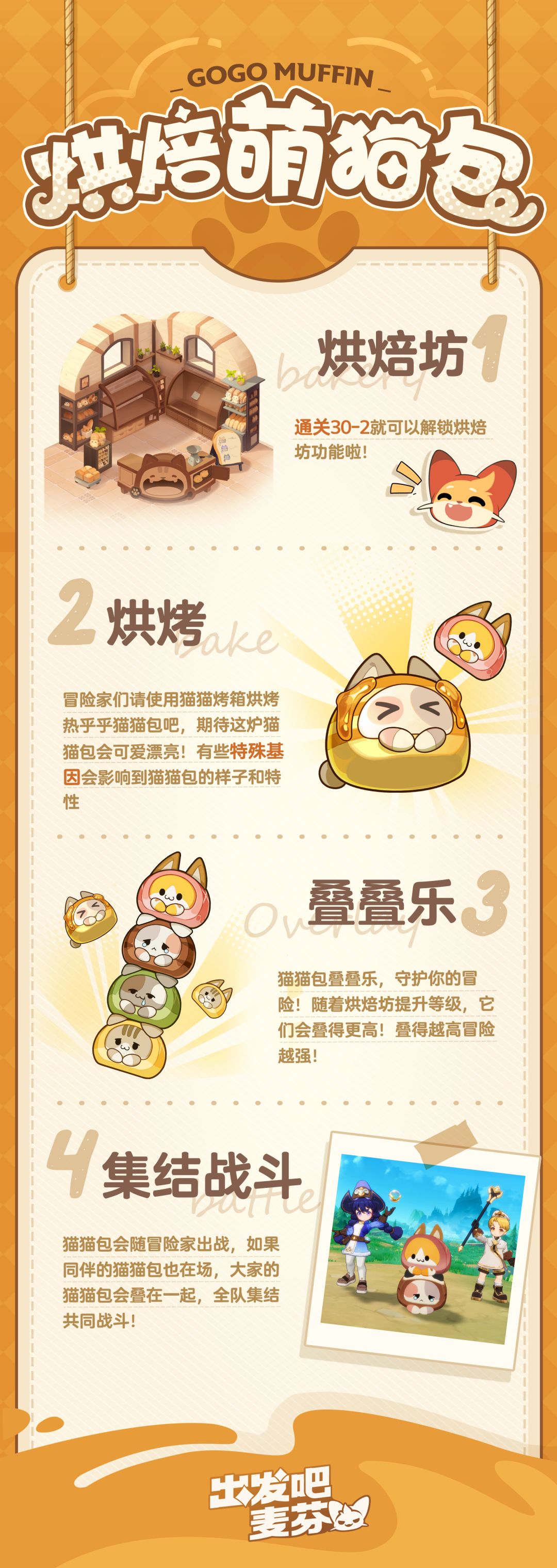 相信有不少冒险家已经解锁猫猫包啦!那猫猫包具体怎么玩呢? ✦ 猫猫包上阵 每位冒险家初始都拥有一只猫猫包,且一旦功能解锁,该猫猫包就能参与战斗! 每只猫猫包都拥有独特的战斗技能,在设定为核心出战时发挥效果,并且随着冒险家烘焙坊等级的提升,最多可以上阵四只猫猫包唷! ✦ 猫猫包孵化 点击升温按钮,增加烤箱温度,直到达到孵化要求。温度达标后,点击温度条上的猫猫包图标,即可孵化一只猫猫包。 您也可以选择