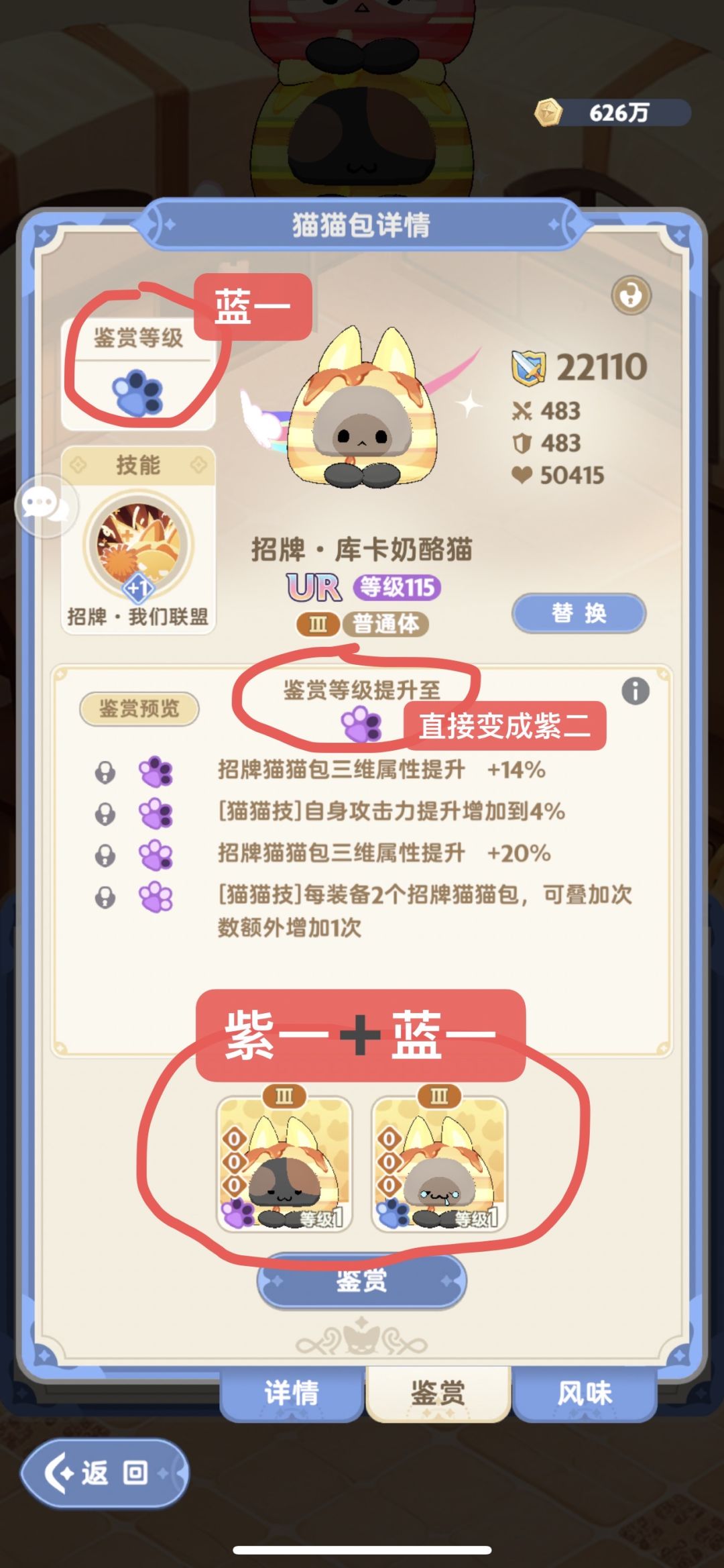猫猫包鉴赏不会损耗猫猫,如图所示,你碰到好的猫猫包了,直接用原先高鉴赏等级的来鉴赏即可,不会有任何损耗。看图片一目了然哦! 各猫猫鉴赏等级需要的猫猫数量如下 蓝一到蓝二:1个 蓝二到蓝三:1个 蓝三到蓝四:2个 蓝四到紫一:1个 紫一到紫二:2个 紫二到紫三:2个 紫三到紫四:3个 所以蓝一到紫四一共需要12个同类型猫猫 后面的金色我还没到,所以也不知道要多少了,见谅!