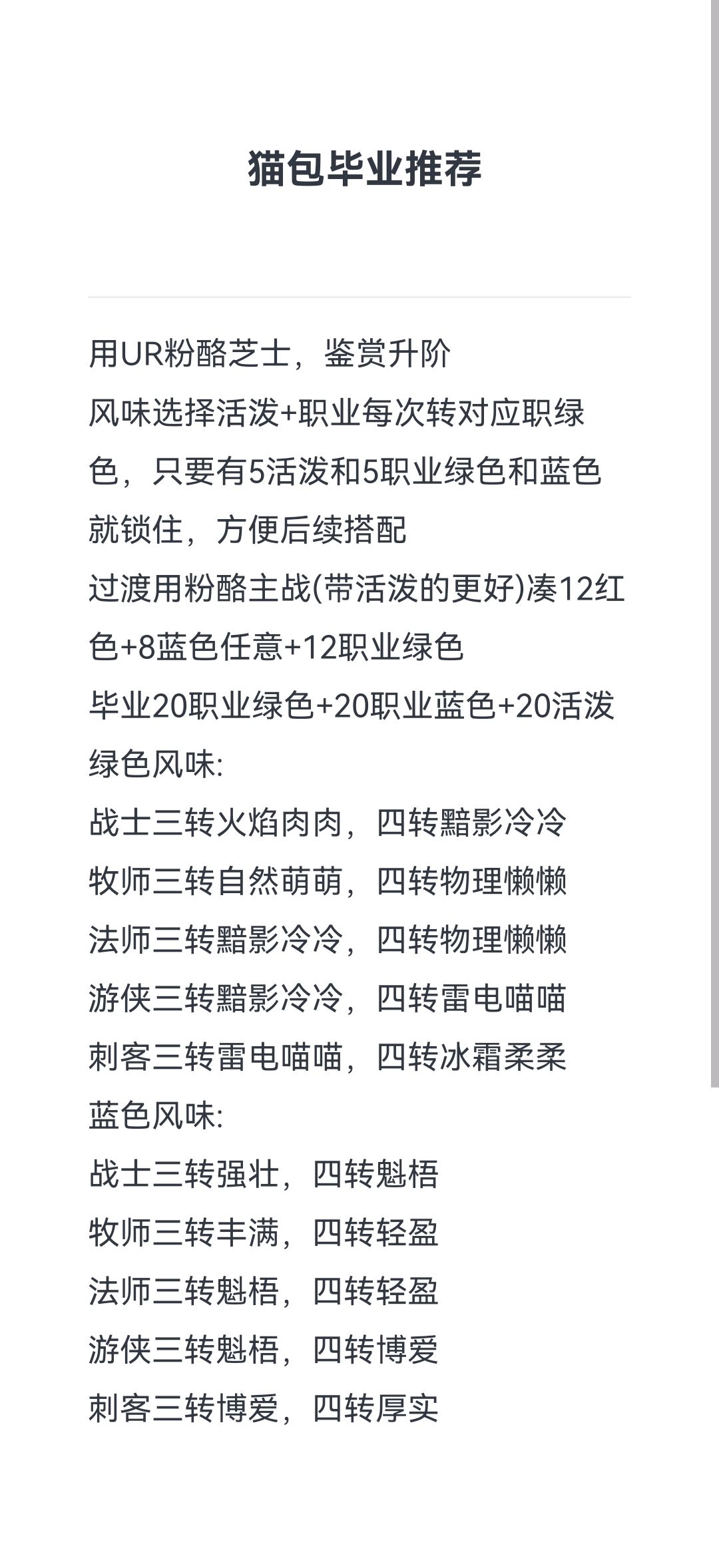 1、UR猫猫包建议在外面直接标识出是哪三种风味,无需点开详情。 因为UR猫猫包必定是三组一样的风味,只需要把三个图标标在猫猫包上,就能在陈列柜一目了然所有风味可能的组合,而不需要点开一个个看或者反复排列组合筛选,大幅节省搭配猫猫包的时间。 2、建议每一次转职可以按上一转技能抽取数量的一定比例返还新的技能卷。 因为每一转会更换核心和专属技能,会导致此前抽的技能完全浪费,不抽没伤害,抽了会淘汰,大多数