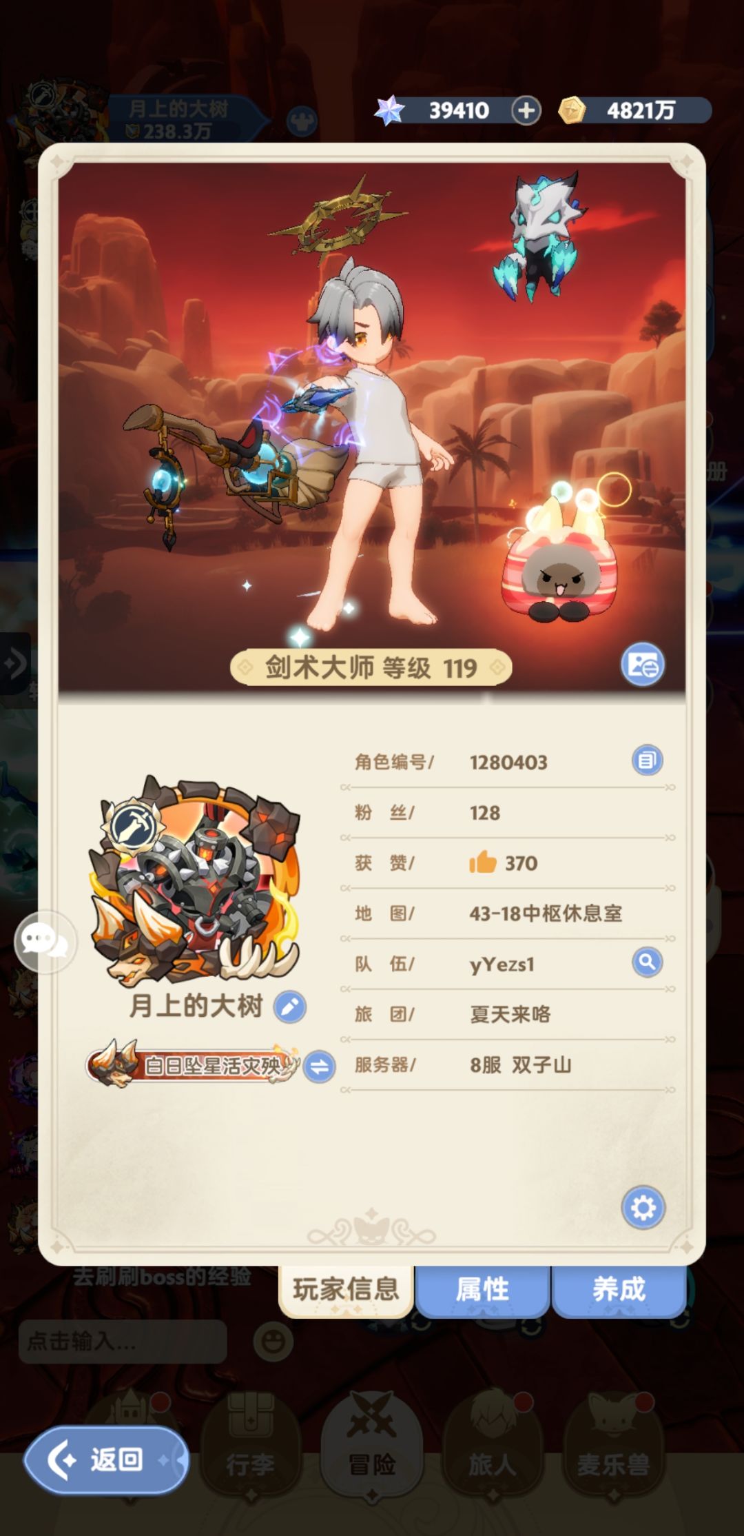 相比各种攻略说要20亿秒伤打,我们看觉得能打就去打了,也感谢前人。 双刺客,龙伤加起来14亿 打了9分多钟,差点狂暴。 因为刺客的破盾原因,选择了留觉醒,留技能,输出低的刺客负责后面主打断增伤。 剑士带虎,副打断增伤。 因为不同于攻略情况说奶可以打断,实际上太过于极限,奶不能打断,奶量压力极大! 以下为成员属性 127万剑士 167万刺客,164万刺客 163万服事 以下是宠物技能,其实参考龙榜伤