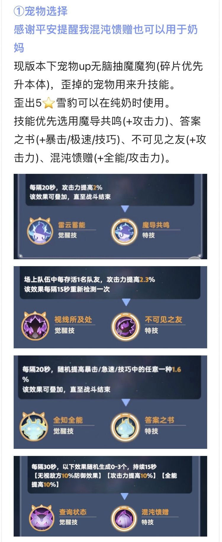 纯辅助不考虑主线有输出带不考虑卡关的情况下(像我就是每关三星都无压力还抽了三个狗现在很后悔现在回追豹子金1然后补智谋多),最优是主宠豹子加智谋多鸣雷声被动技能!!!别听别人说无脑魔魔狗[表情_微笑]。看好奶量加成是所有升星那边给你加的 抽的顺序是智谋多>鸣雷声>乌鸦>雪豹 雪豹金1就够且肯定能卡到下个阈值所以完全等歪就行 优先提升技能等级 而魔魔狗你肯定是奔着金5去的,如果平民奶打算走全输出金5魔
