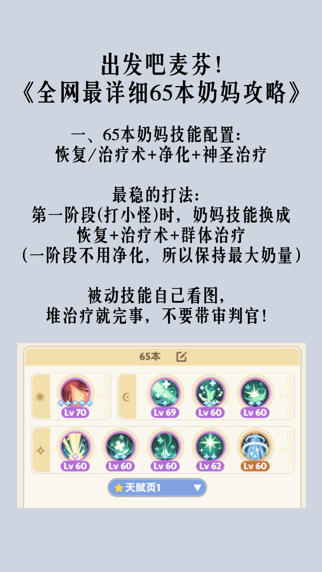 没有硬实力就得手动(悲),服事真的太难啦,在此写一下通关记录 [表情_猫咪举手] 【秘境65】推荐战力9万+ 主动技能:神圣治疗、净化术、恢复 其他: 1.长按自动,选“恢复”为自动 2.boss遗言(麦芬提示+主动技变绿色+字)→不要用主动技能,取消自动,结束后参照1打开 3.boss传染(二阶段没有麦芬提示,要注意看灰条和字,灰条结束后放技能)→净化术 4.boss暴力砸地(麦芬提示+灰条+字