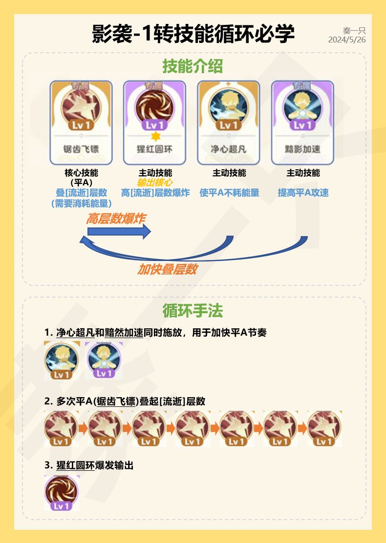 很多影袭在1转后没有反应过来技能机制的变化——围绕圆环这一输出核心的打法,在打龙还有下本时使用了“自动模式”同时释放所有技能,导致【无法发挥影袭1转后应有的伤害】,本篇对技能循环进行初步的探讨,如有不足之处请指正。 关于平A锯齿飞镖次数,目前考虑净心超凡和黯然加速的增伤效果为3.5秒,我平A的次数大约为7次,能叠满[流逝]33层同时使猩红圆环在增伤期间内施放。 关于如何自动: 自动可以记忆技能