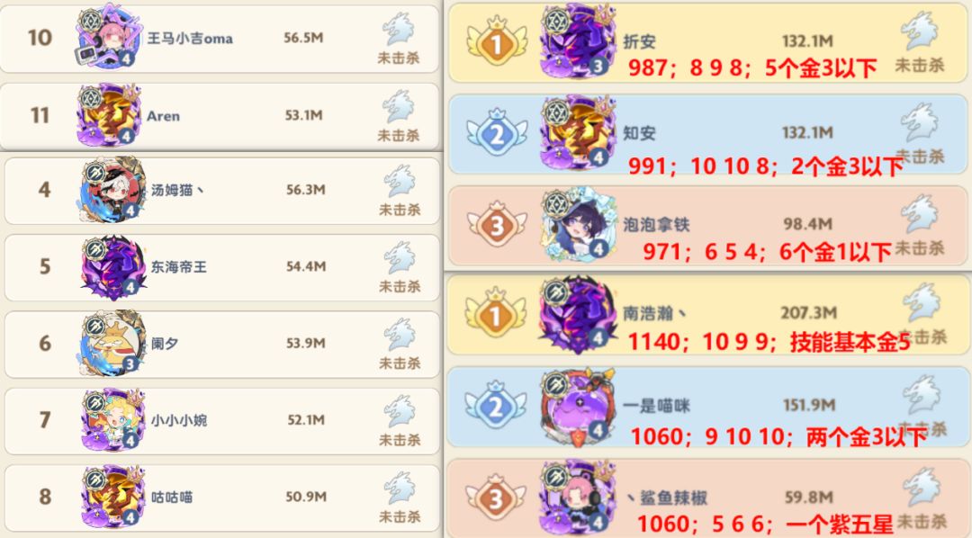 一区氪金量太大没有参考价值(大氪100名都排不完) 这里统计三区榜单,从顶氪到普通玩家正好能在榜上一一对比。 结论 (顶氪-次顶-大氪-中氪-微氪): 前三:顶氪刺客被次顶氪法师追上,次顶氪刺客被爆杀 前十:刺客4-10全都被法师第10踩头 二十名(图2):大氪刺客伤害比不过平均低100k的法师 五十名(图3):中氪刺客伤害和平均低85k法师持平(宠物差距更大) 一百名(图4):依旧是法师以较低的
