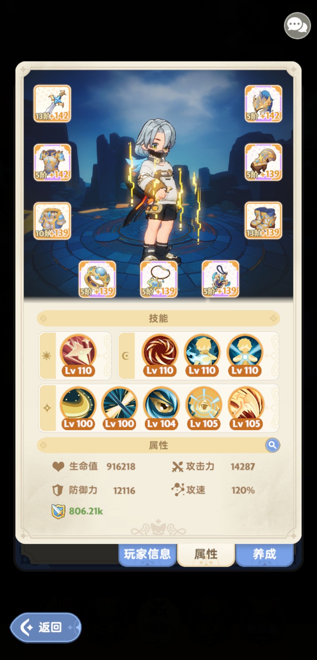 左线类似二转一锤法师,赌巧爆,优先拉高巧爆,1急速=0.85%冰伤 天赋:左线,暴击,技巧 战技:五步,返璞,专属 被动:两个专属,缓慢,雨露,触类 手法:五步->返璞->专属,等读条最后一点手动觉醒 我的面板如下,猫用的四个三代猫,硬币金3,坐骑用的虹光,两暴击两技巧 虽然我的伤害确实挺低的,不过比我昨天用五步自动右线伤害稍微高点,我昨天左线5000-6000亿,右线9800亿多一点,用