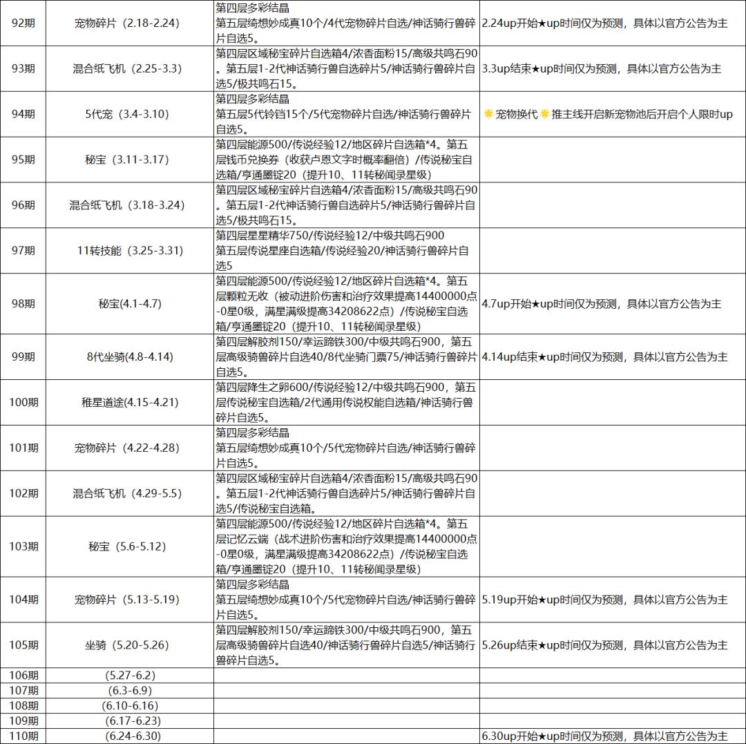 up时间仅为预测,做哪期看自己的规划和喜好。 纸飞机预测图每周原帖更新,可放心收藏食用。 纸飞机预测内容根据台服纸飞机内容写的,国服内容可能会发生变化。 因为2代神话骑行兽上线的原因,纸飞机内1代神话骑行兽碎片变为1-2代神话骑行兽碎片自选。 [表情_流口水]打个广告:无忧小筑长期收人,id100006,无任何要求,有大群,有一堆妹妹