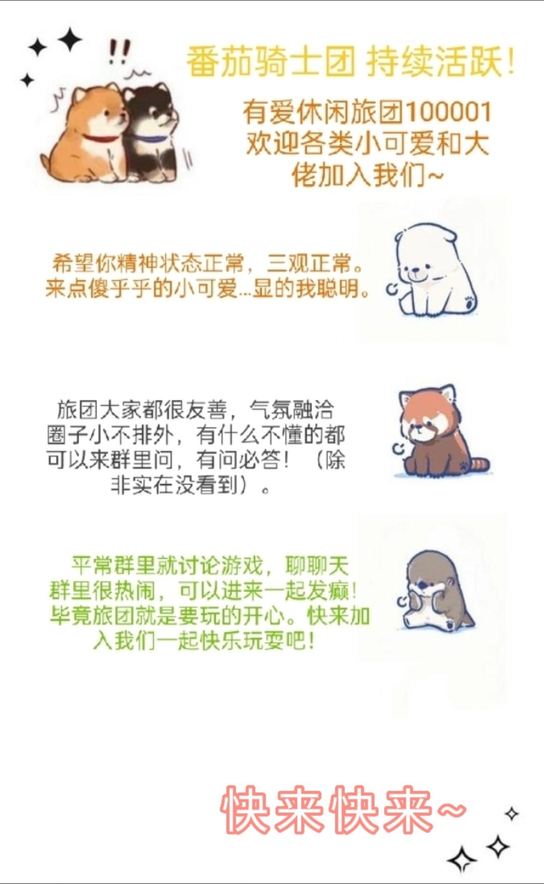 有没有小团体合一下呀?来14个好兄弟赶快~风里雨里~ 番茄骑士团等你 哇酷哇酷 ୧((〃•̀ꇴ•〃))૭⁺✧ 希望你也和我们一样 有爱~ 喜欢麦芬这个游戏! 旅团有企鹅群 陪你到关服~ 对啦!我们在一区昂~