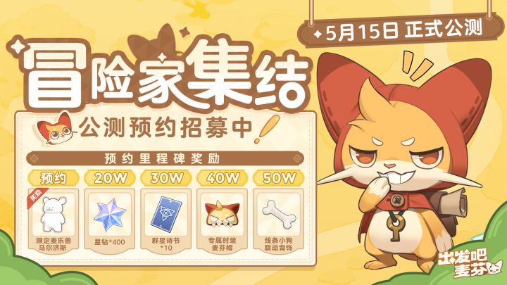 各位冒险家们,现在预约即可在公测获得线条小狗联动限定麦乐兽:马尔济斯!(冒险家到达30级解锁麦乐兽系统后,便可立即在游戏里联动活动领取麦乐兽“马尔济斯”)《出发吧麦芬》将于5月15日正式公测!赶紧跟上呀😽😽😽还有丰富的预约里程碑奖励等着你哦,快集结你的冒险伙伴,一起预约吧!立即预约: 线条小狗联动公告: ——想要修勾小骨头的二狗子#出发吧麦芬#安利一下出发吧麦芬