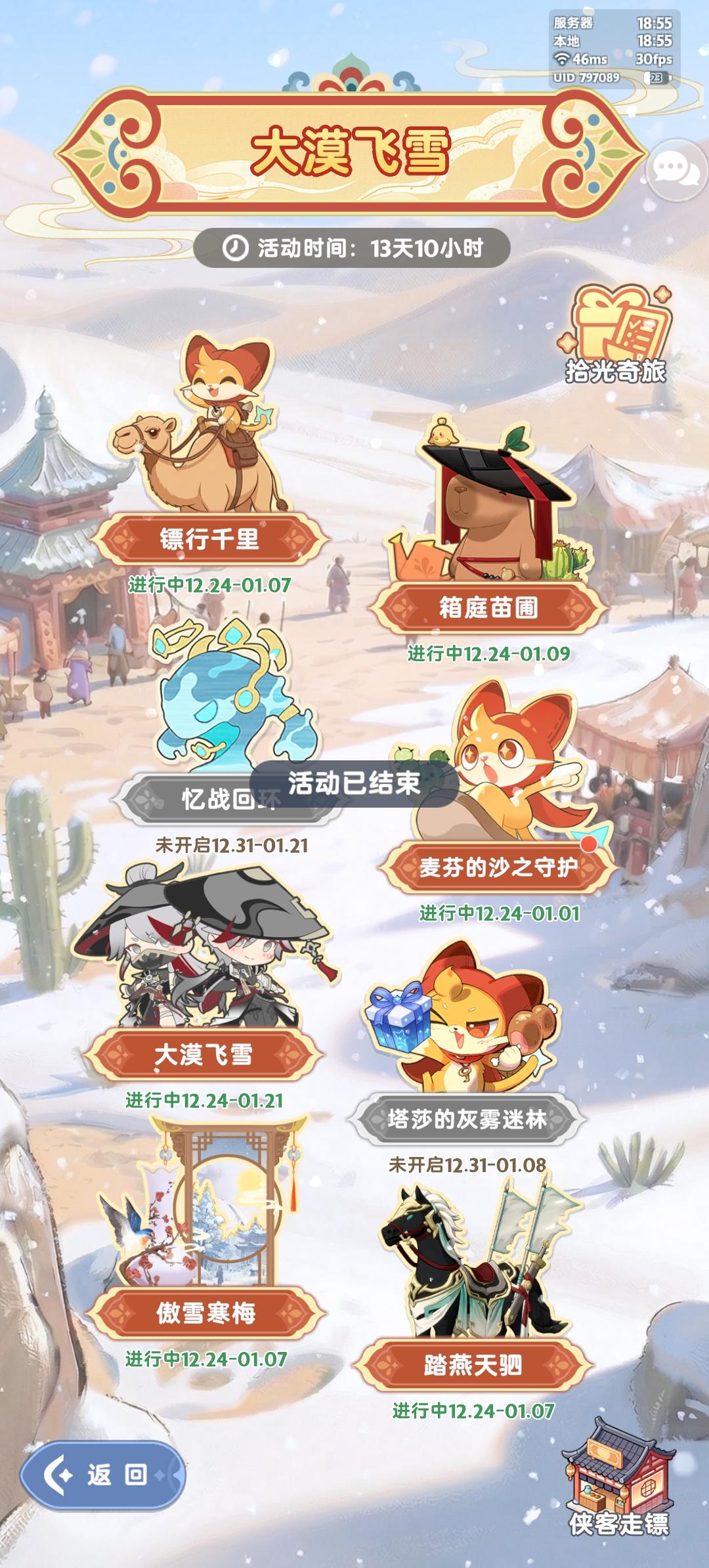 亲爱的冒险家们,外头是大漠纷飞的雪花,车里是滋滋冒油的烤肉香。一起来看看双旦都有什么活动吧~✦ 沙之守护 ✦漫天黄沙也不能摧毁我们要守护的一切!活动「沙之守护」即将开启。⏰活动时间:2025年12月24日5:00-2025年12月31日4:00每日参与活动即可获得各类养成资源~✦ 沙海粒粟 ✦沙海里的箱庭苗圃,播种也会收获满满!⏰活动时间:2025年12月24日5:00-202